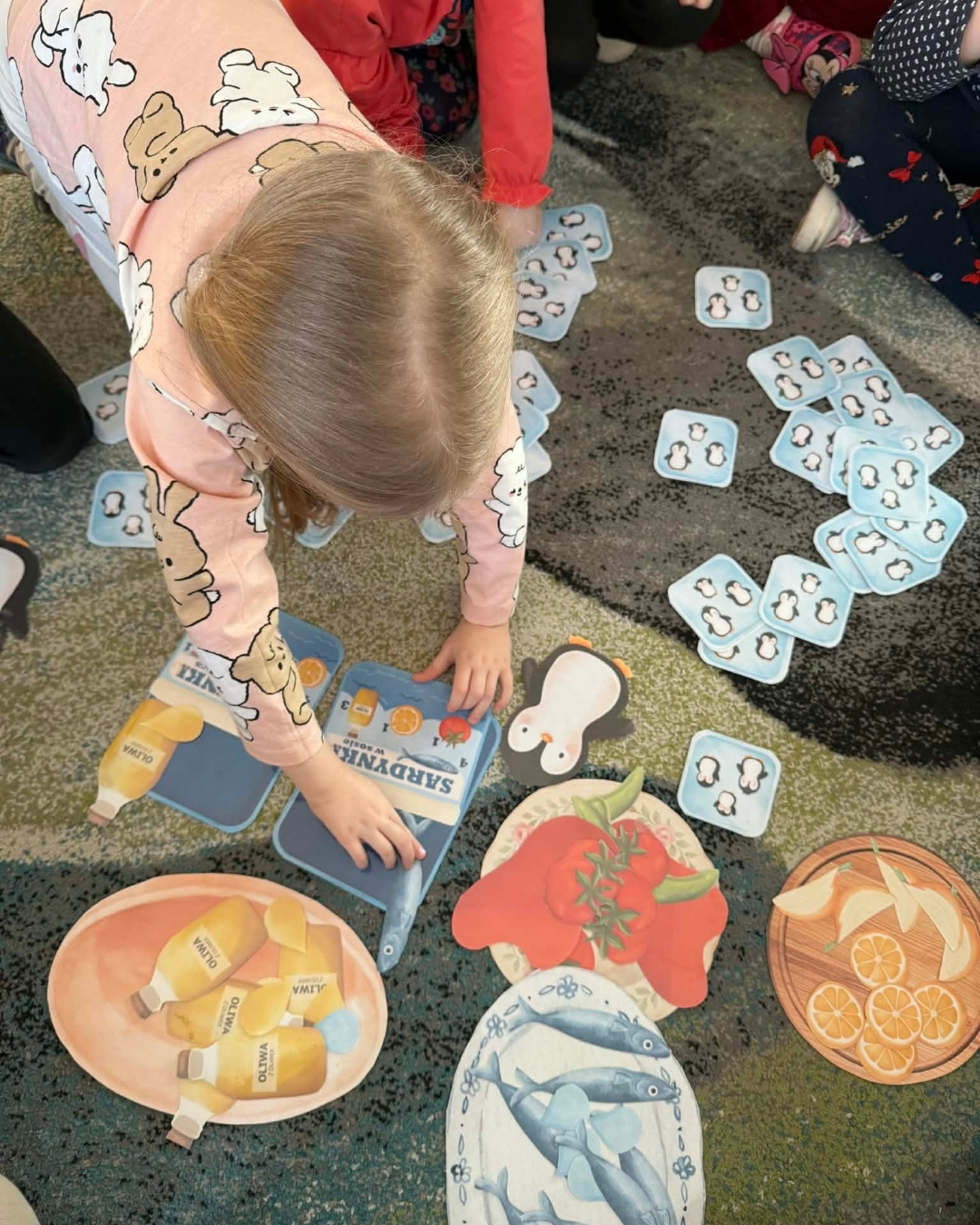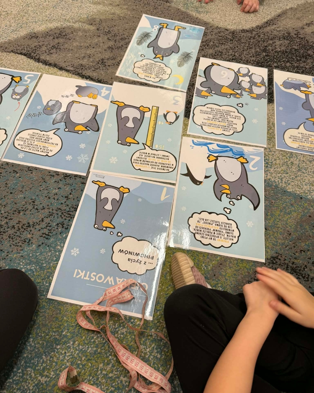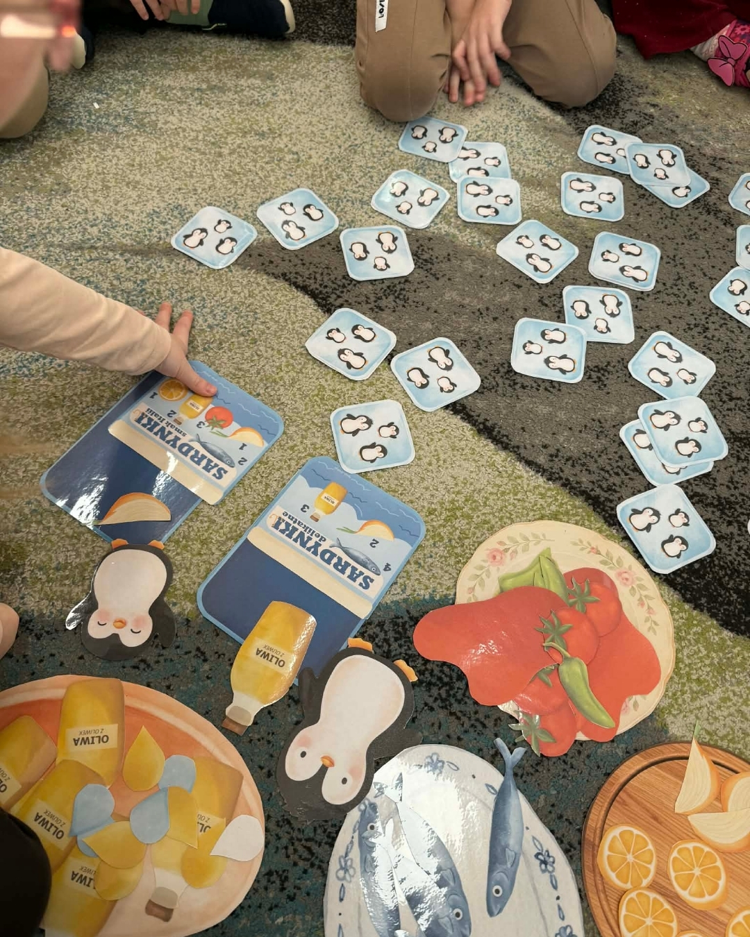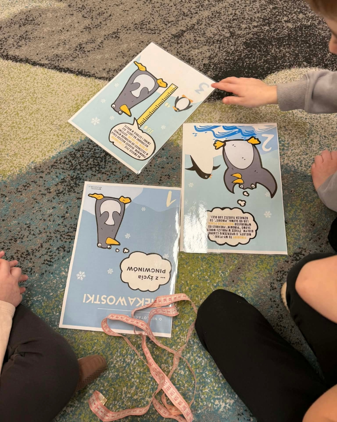 Dzień Wiedzy o Pingwinach był pełny radości, śmiechu, rywalizacji, ale przede wszystkim nauki. Matematyka jest ukryta wszędzie! Dzieci poznały ciekawostki o pingwinach, wzięły udział w quizie wiedzy oraz ćwiczeniach matematycznych i logicznych. Przy pomocy miarki mierzyły się wspólnie, żeby sprawdzić czy pingwiny są od nich mniejsze czy większe, liczyły przy użyciu klamerek, szukały brakujących liter do słów, co było okazją do doskonalenia umiejętności czytania. Największą atrakcją okazała się gra edukacyjna “Sardynki dla Kostków”, która wzbudziła ogromne zainteresowanie, zaangażowanie i emocje. Uczestnicy wzajemnie się dopingowali i radością reagowali na każde zwycięstwo. W grze dzieci doskonaliły liczenie, pamięć i logiczne myślenie. Emocje towarzyszyły dzieciom nawet podczas swobodnej zabawy, gdyż poprosiły o możliwość zagrania w tą grę jeszcze raz. Przedszkolaki wykonały także kreatywne prace plastyczne. Dzieci stwierdziły, że są wielkimi fanami pingwinów. Była to doskonała okazja do tego, by stwierdzić, że matematyka jest wszędzie!