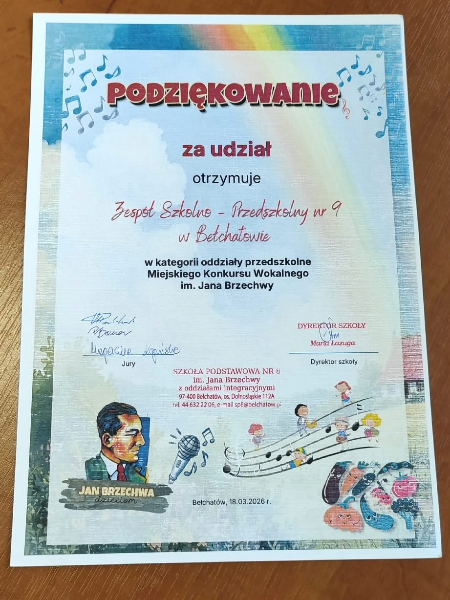 W Szkole Podstawowej nr 8 w Bełchatowie odbyła się kolejna edycja Miejskiego Konkursu Wokalnego im. Jana Brzechwy. W kategorii - oddziały przedszkolne - udział wzięły wokalistki z naszego przedszkola: Jagoda z grupy „Motylki”, która zaprezentowała utwór pt.: Żaba oraz Lena z grupy „Smerfy”, która wyśpiewała utwór „ Pomidor”. Wielkie gratulacje dla dziewczynek za odwagę oraz za dostarczenie wspaniałych muzycznych przeżyć.