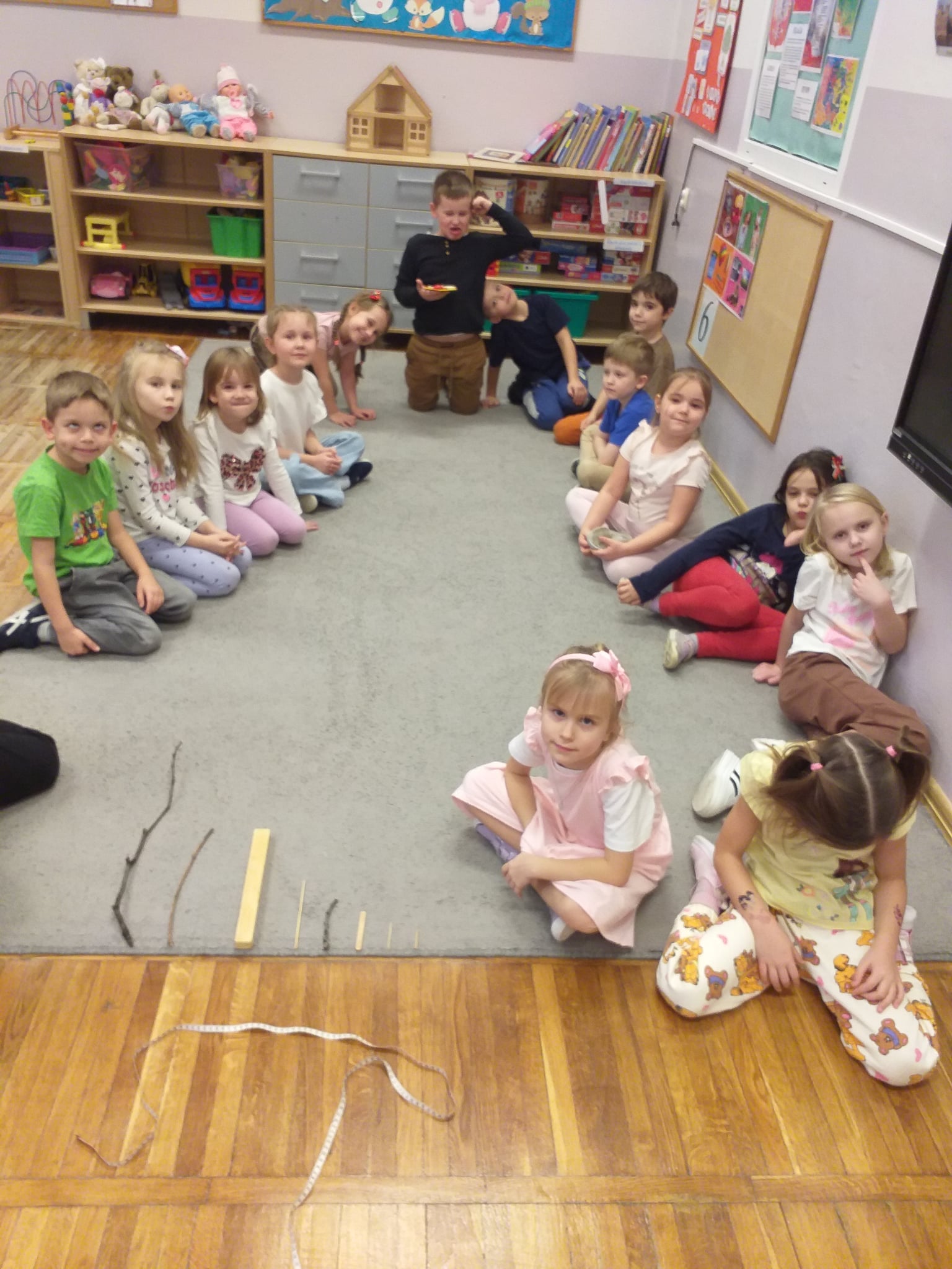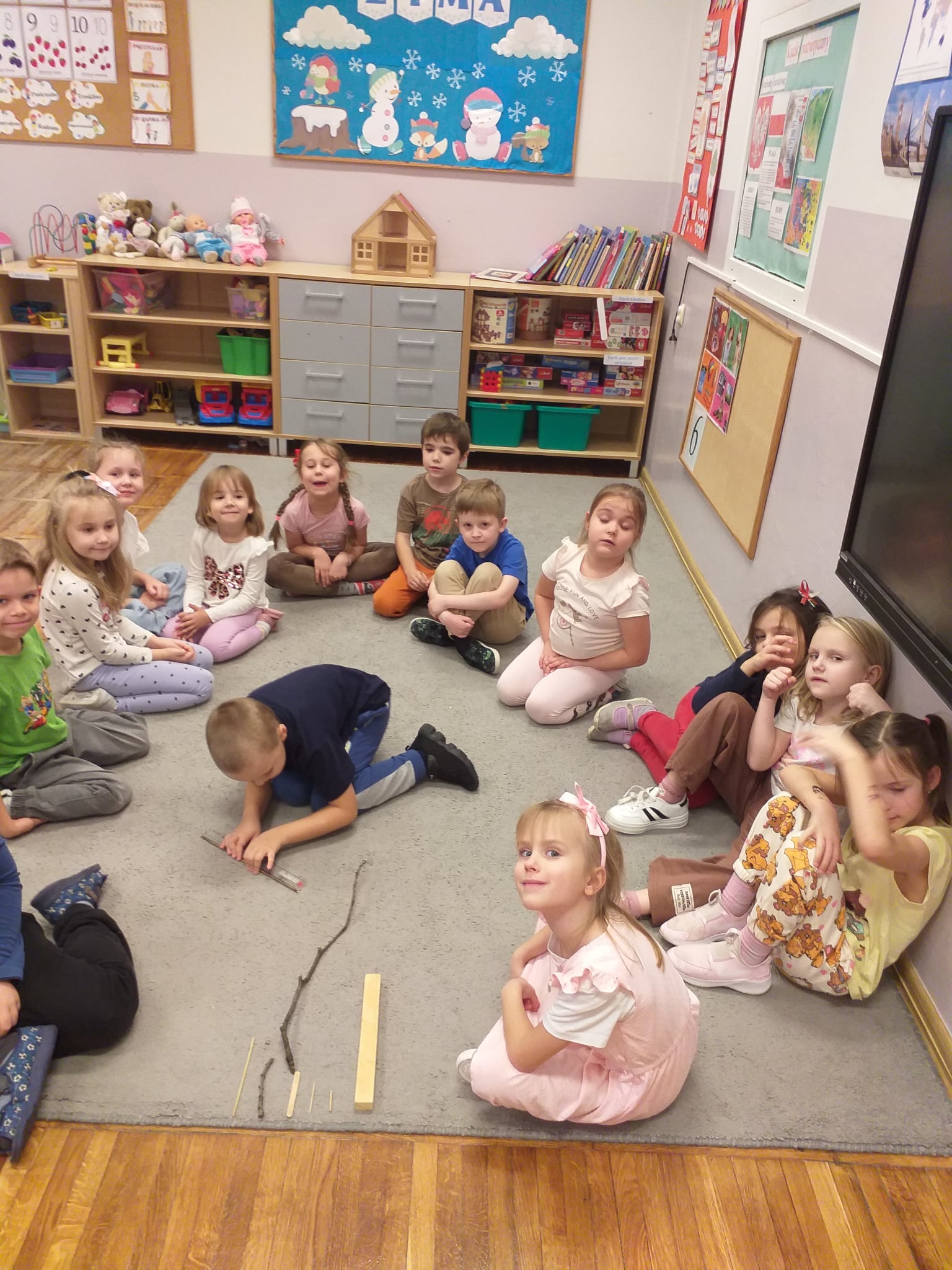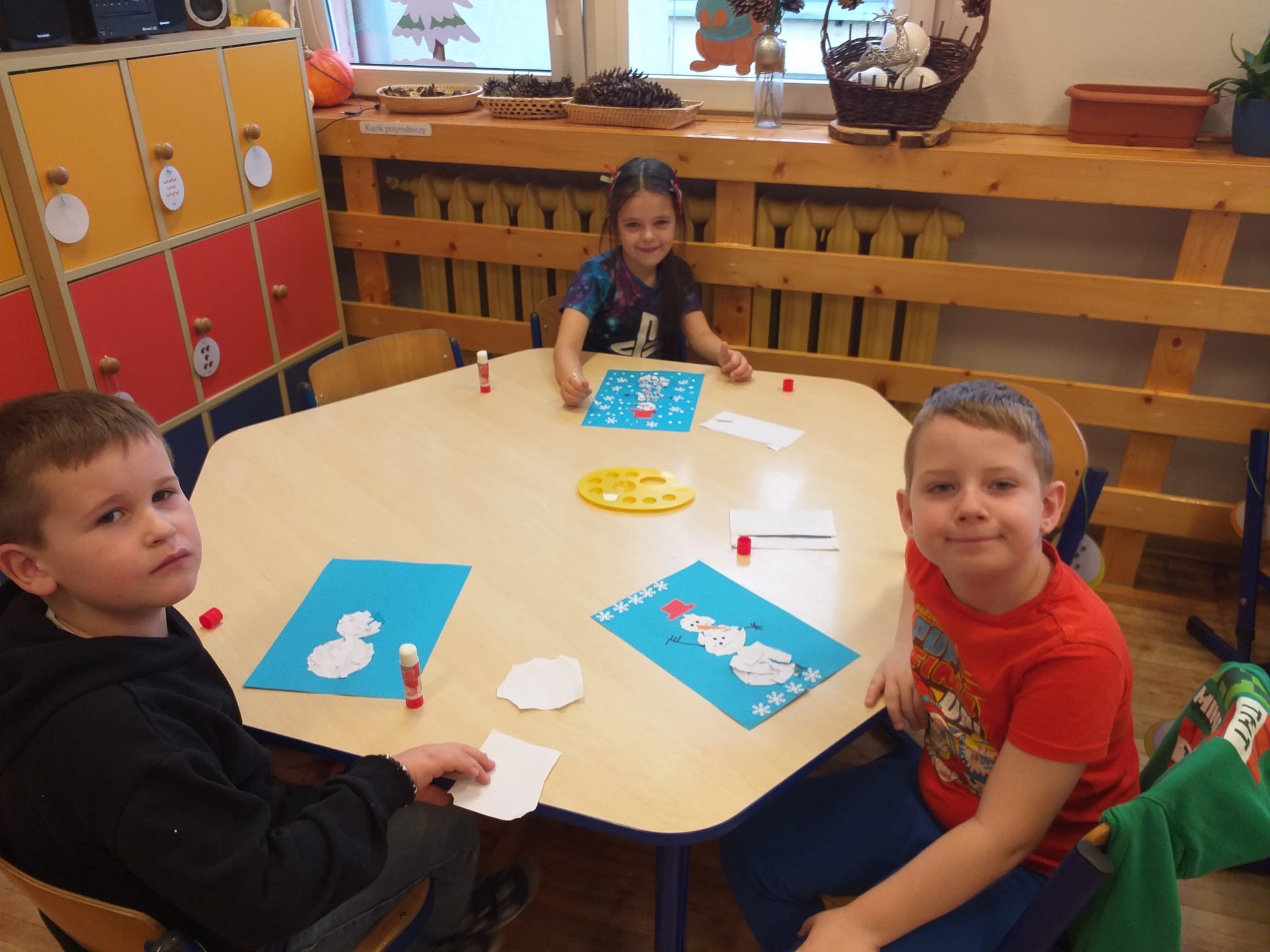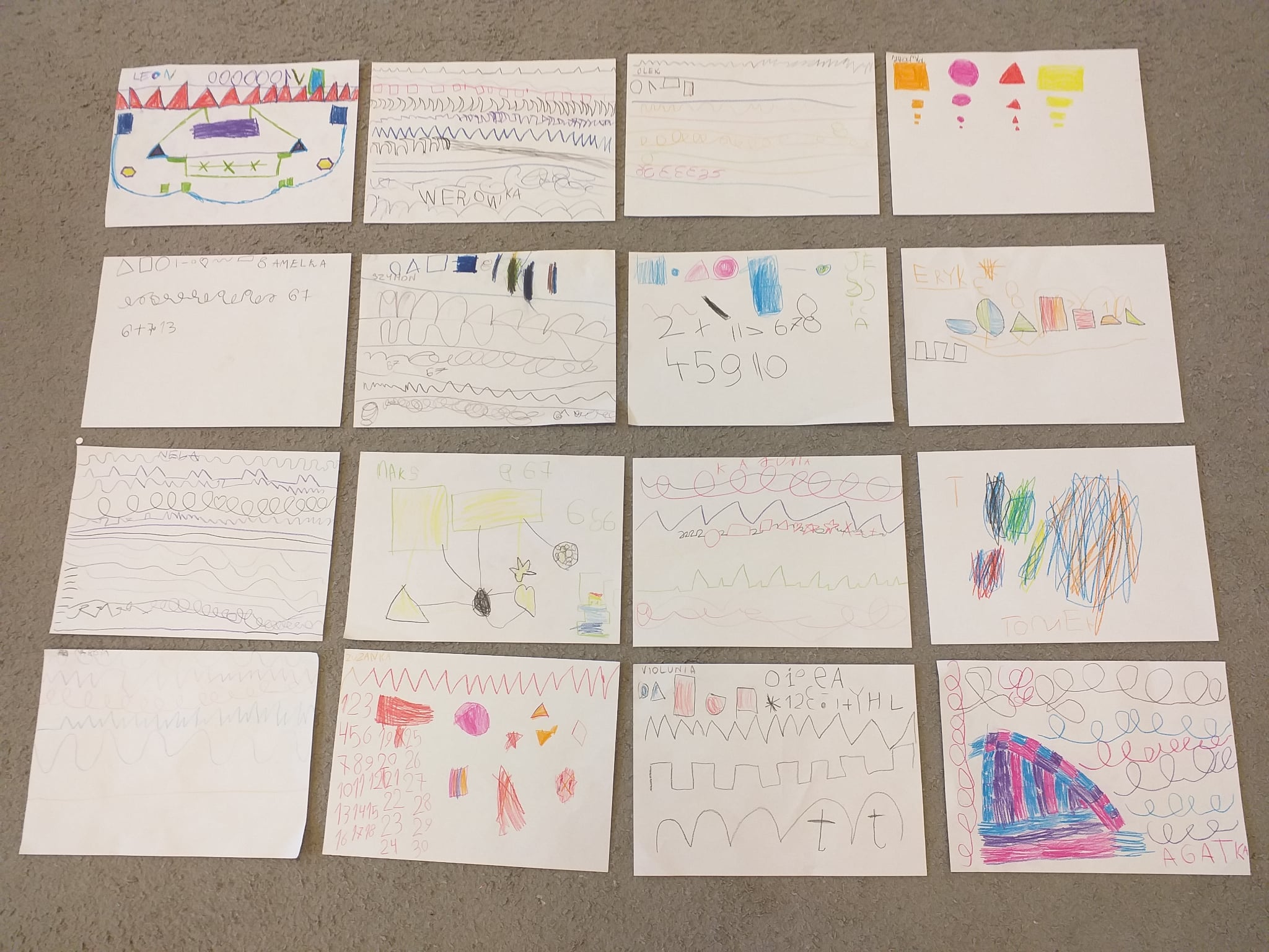 Od początku roku szkolnego dzieci z grupy Odkrywcy realizują Ogólnopolski Projekt Edukacyjny „Kreatywna Matematyka”. Jak sama nazwa wskazuje, jego celem jest innowacyjne i pomysłowe podejście do edukacji matematycznej poprzez wielozmysłowe poznawanie świata liczb, figur geometrycznych, działań oraz zagadnień matematycznych. Do tej pory wykonaliśmy 5 zadań zaproponowanych przez organizatorów projektu. Pierwsze zadanie polegało na układaniu patyków w szeregi, określaniu ich długości, a następnie ich mierzeniu. Drugie zadanie polegało na ustalaniu wyniku odejmowania kasztanów, które znikały pod jesiennym liściem. Trzecie zadanie polegało na dorysowywaniu dowolnych elementów do konturu koła, tak aby stworzyć pewien obraz. Czwarte zadanie polegało na rysowaniu na kartkach poznanych przez dzieci wzorów geometrycznych, figur geometrycznych, cyfr i znaków matematycznych. Piąte zadanie stanowiło wykonanie pracy plastycznej - obrazka z bałwankiem. Trzeba było wykleić kontur bałwanka kawałkami białego papieru, dokleić mu potrzebne elementy, a na tle umieścić śnieżynki. Zadaniem dzieci było także liczyć wszystkie elementy wykonywanej przez siebie pracy plastycznej.