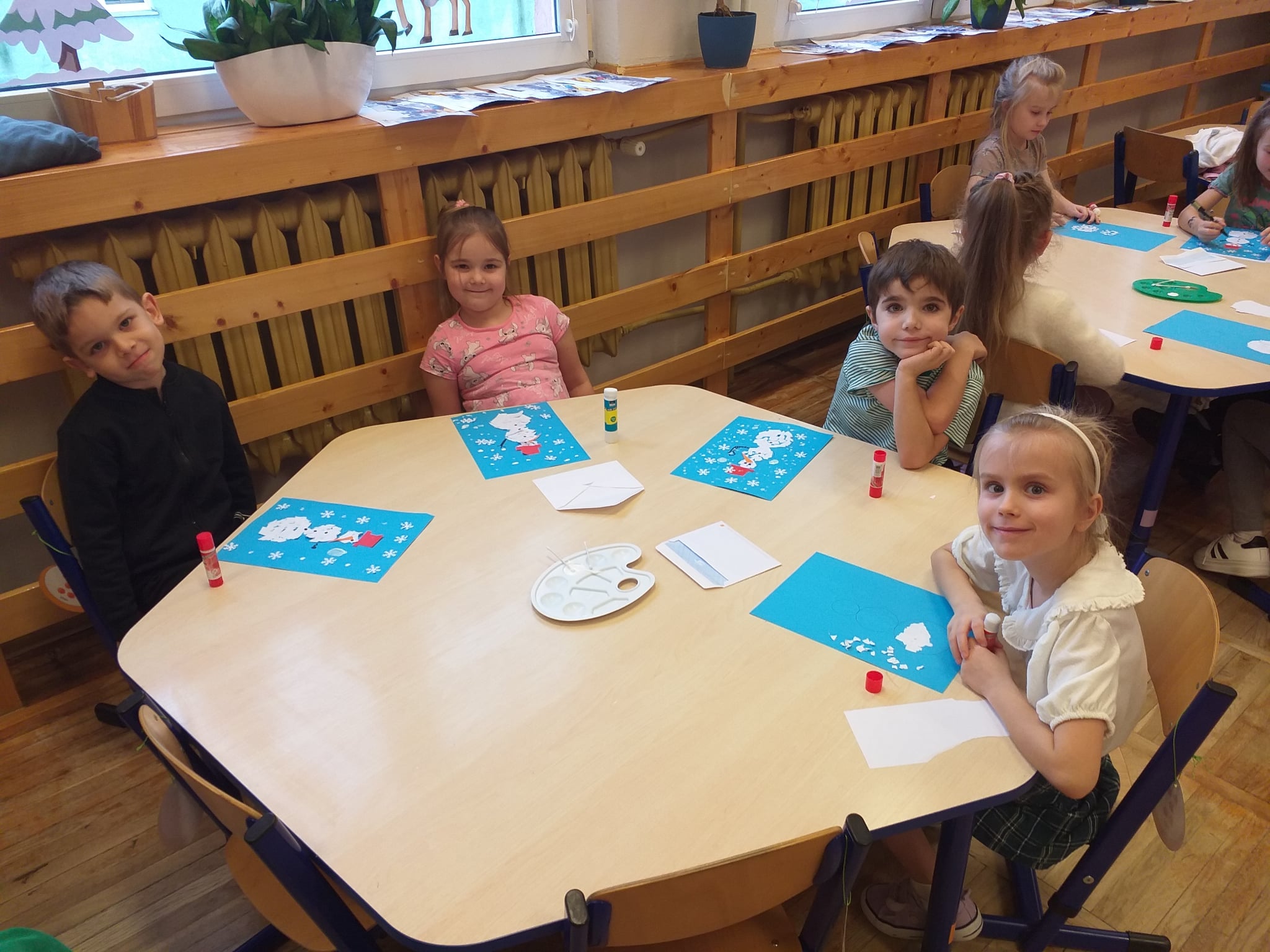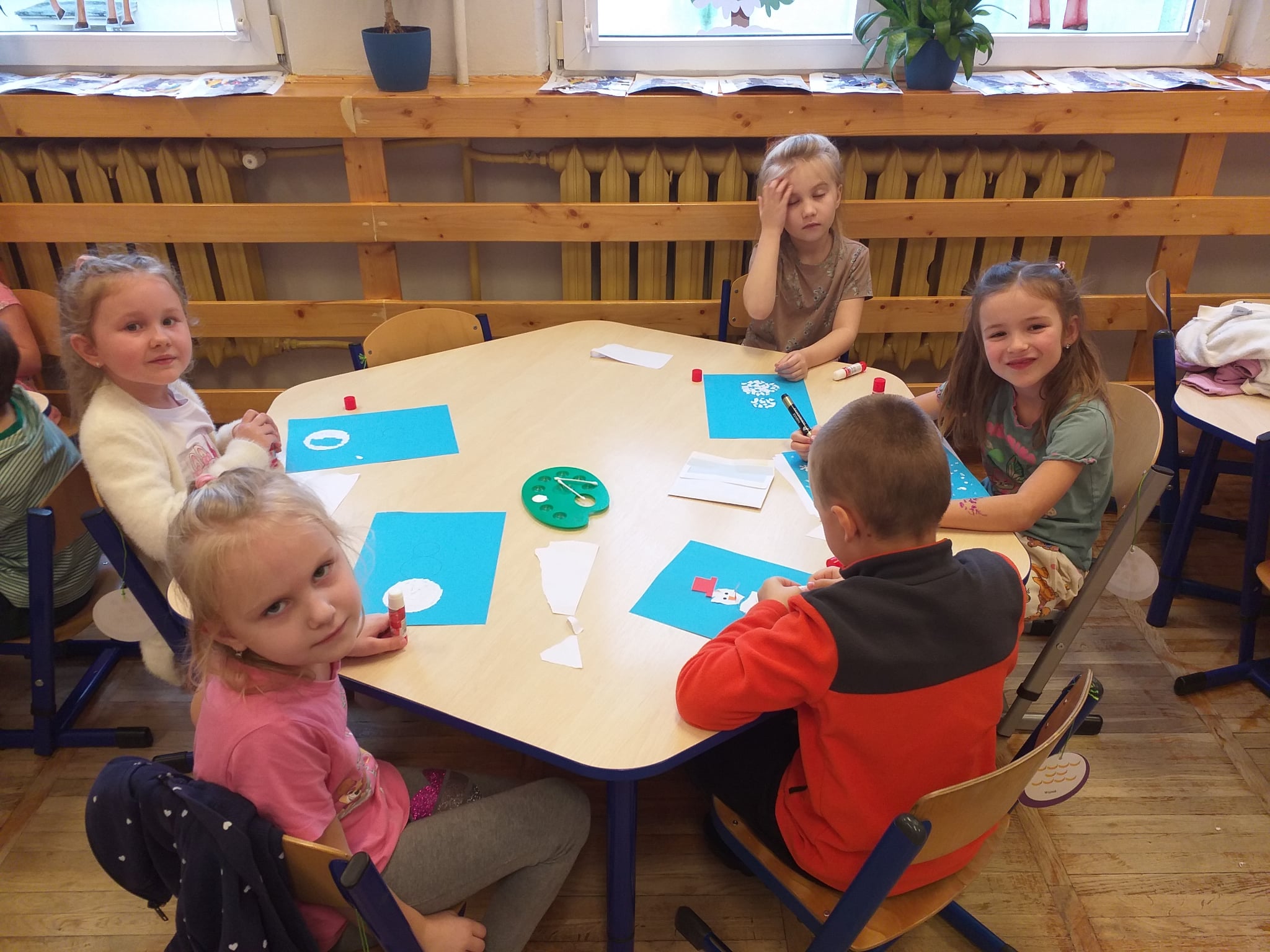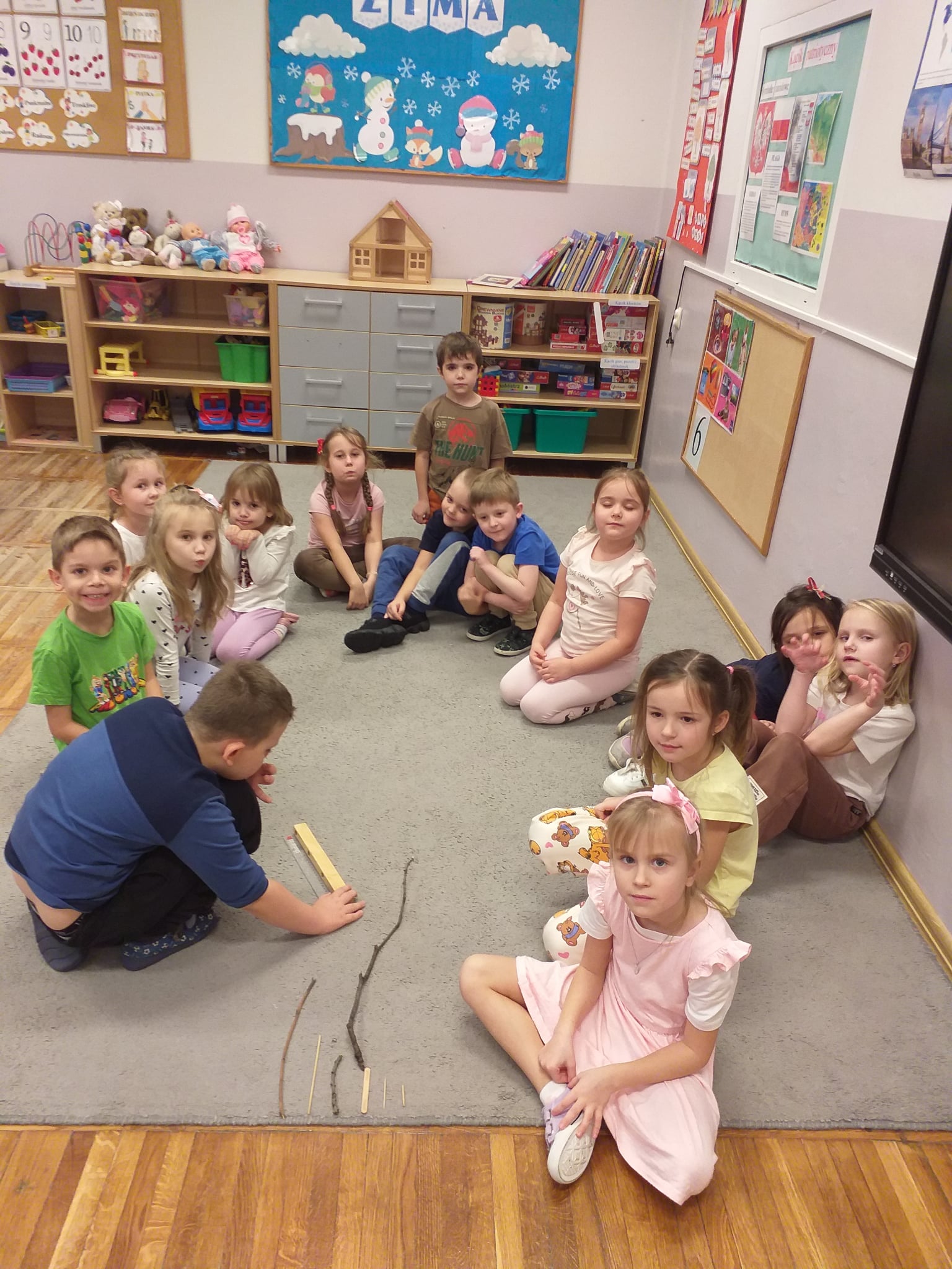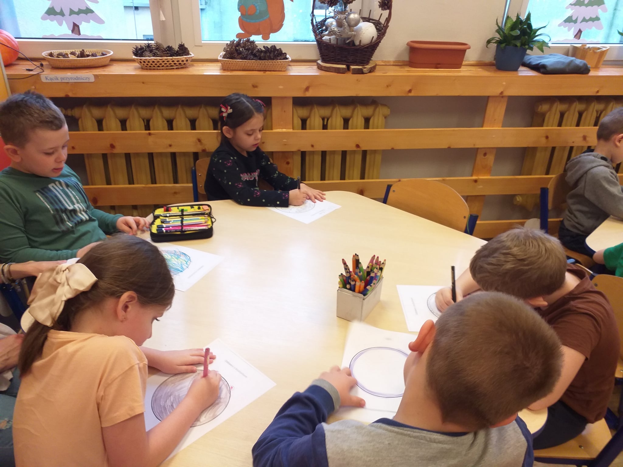 Od początku roku szkolnego dzieci z grupy Odkrywcy realizują Ogólnopolski Projekt Edukacyjny „Kreatywna Matematyka”. Jak sama nazwa wskazuje, jego celem jest innowacyjne i pomysłowe podejście do edukacji matematycznej poprzez wielozmysłowe poznawanie świata liczb, figur geometrycznych, działań oraz zagadnień matematycznych. Do tej pory wykonaliśmy 5 zadań zaproponowanych przez organizatorów projektu. Pierwsze zadanie polegało na układaniu patyków w szeregi, określaniu ich długości, a następnie ich mierzeniu. Drugie zadanie polegało na ustalaniu wyniku odejmowania kasztanów, które znikały pod jesiennym liściem. Trzecie zadanie polegało na dorysowywaniu dowolnych elementów do konturu koła, tak aby stworzyć pewien obraz. Czwarte zadanie polegało na rysowaniu na kartkach poznanych przez dzieci wzorów geometrycznych, figur geometrycznych, cyfr i znaków matematycznych. Piąte zadanie stanowiło wykonanie pracy plastycznej - obrazka z bałwankiem. Trzeba było wykleić kontur bałwanka kawałkami białego papieru, dokleić mu potrzebne elementy, a na tle umieścić śnieżynki. Zadaniem dzieci było także liczyć wszystkie elementy wykonywanej przez siebie pracy plastycznej.