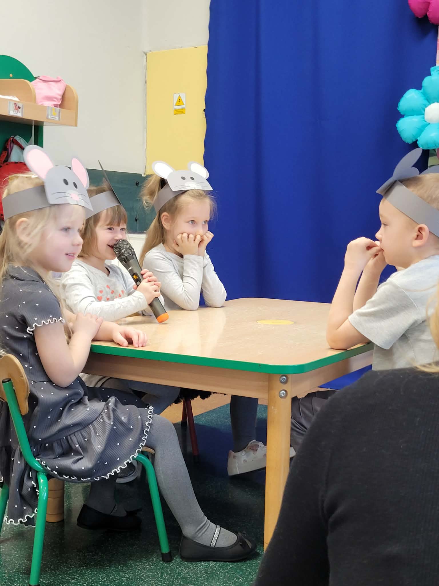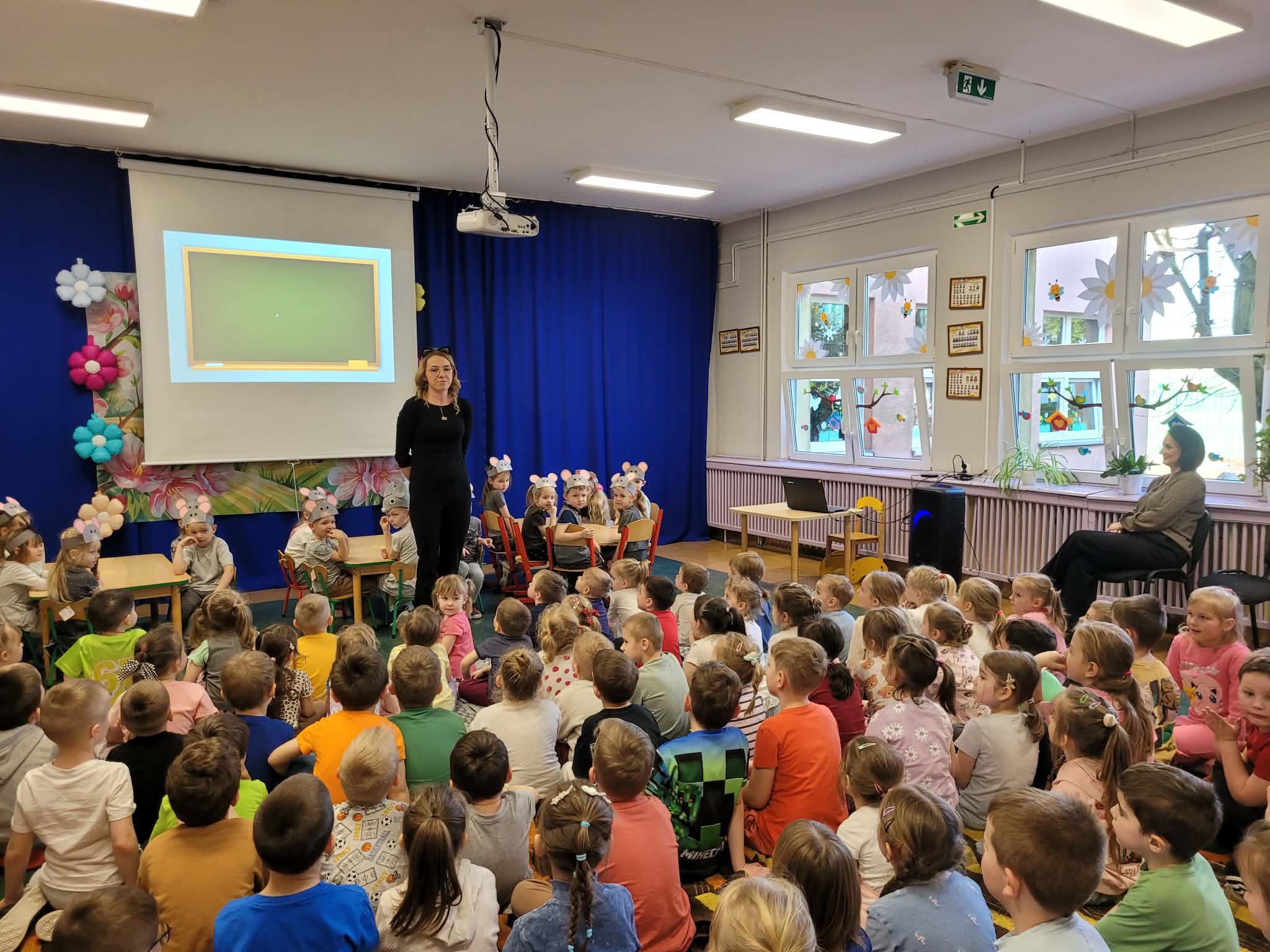 Z okazji Dnia Kota dzieci z grupy Słoneczka oraz Misie zaprosiły wszystkie przedszkolaki do szkoły myszek. W przedstawieniu zaprezentowały wierszyki oraz piosenkę „Kot pomocnik” za co zostały nagrodzone gromkimi brawami.