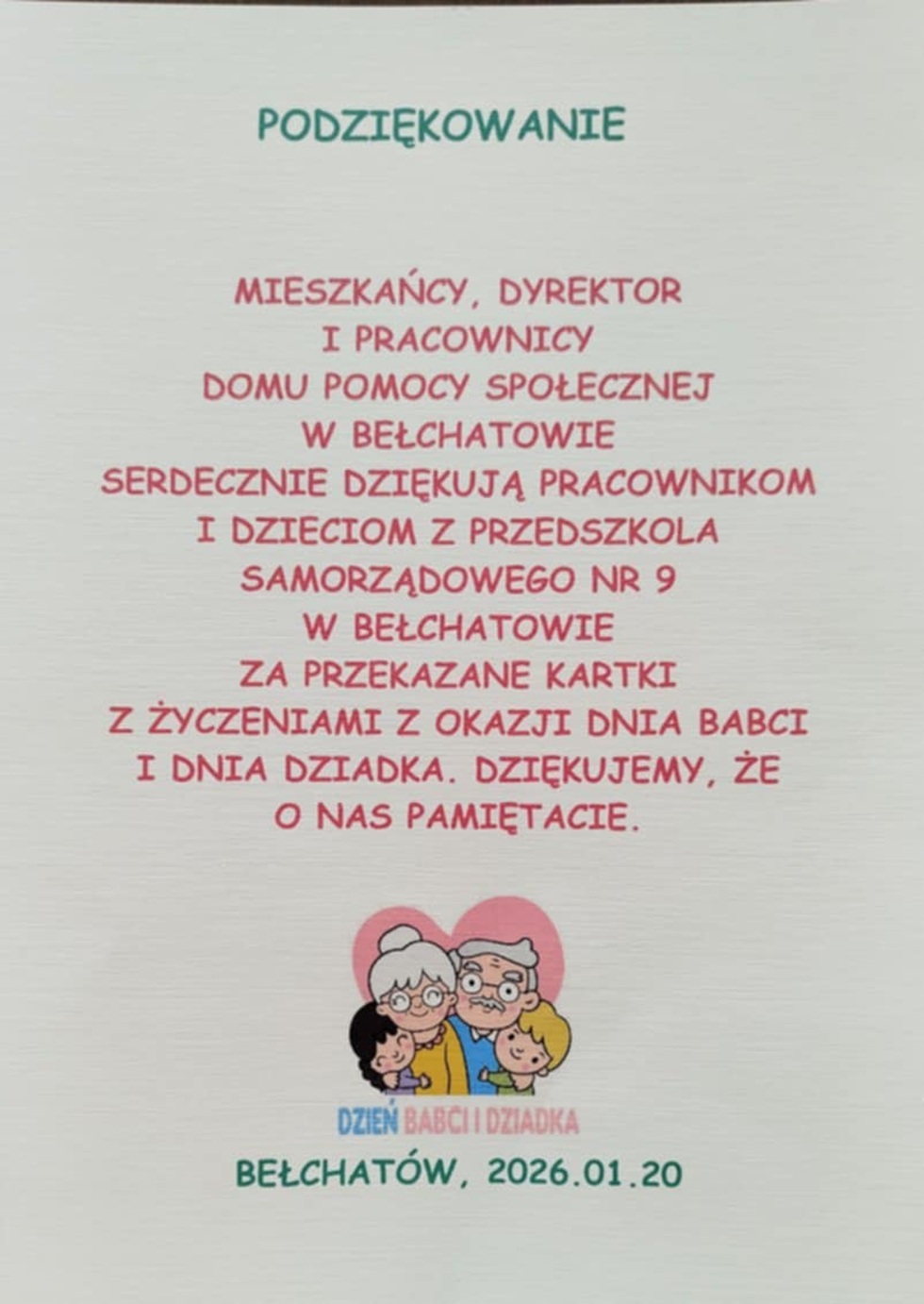 W ramach Dnia Babci i Dziadka, jak co roku przedszkolaki nie zapomniały o pensjonariuszach Domu Pomocy Społecznej w Bełchatowie. Dzieci z grupy: „Biedronki”, „Stokrotki”, „Słoneczka” i „Motylki” samodzielnie przygotowały laurki, do środka których wklejone zostały wierszyki z życzeniami. Upominki zostały przekazane kierownictwu placówki, a następnie trafiły do pensjonariuszy sprawiając im wielka radość.