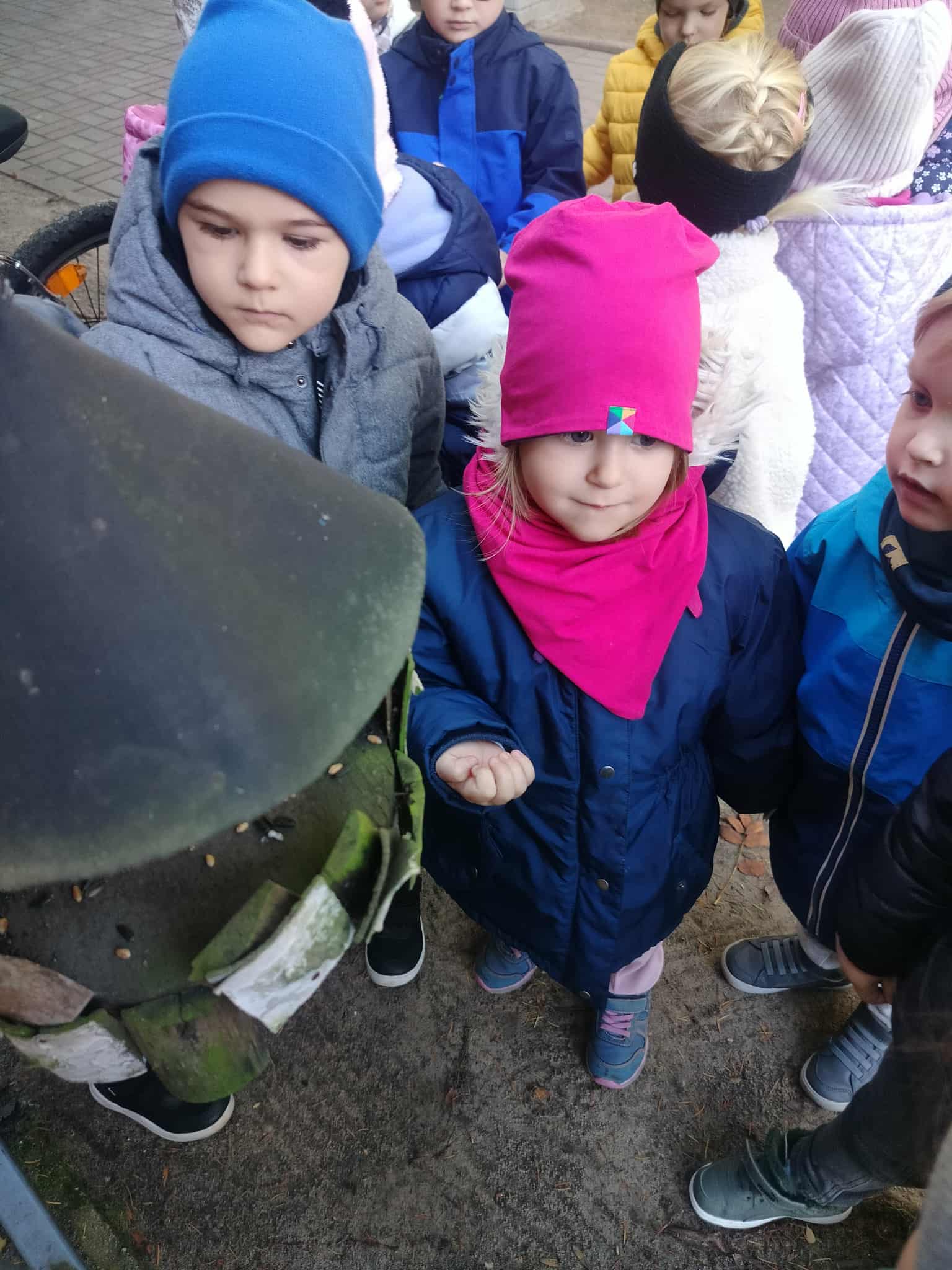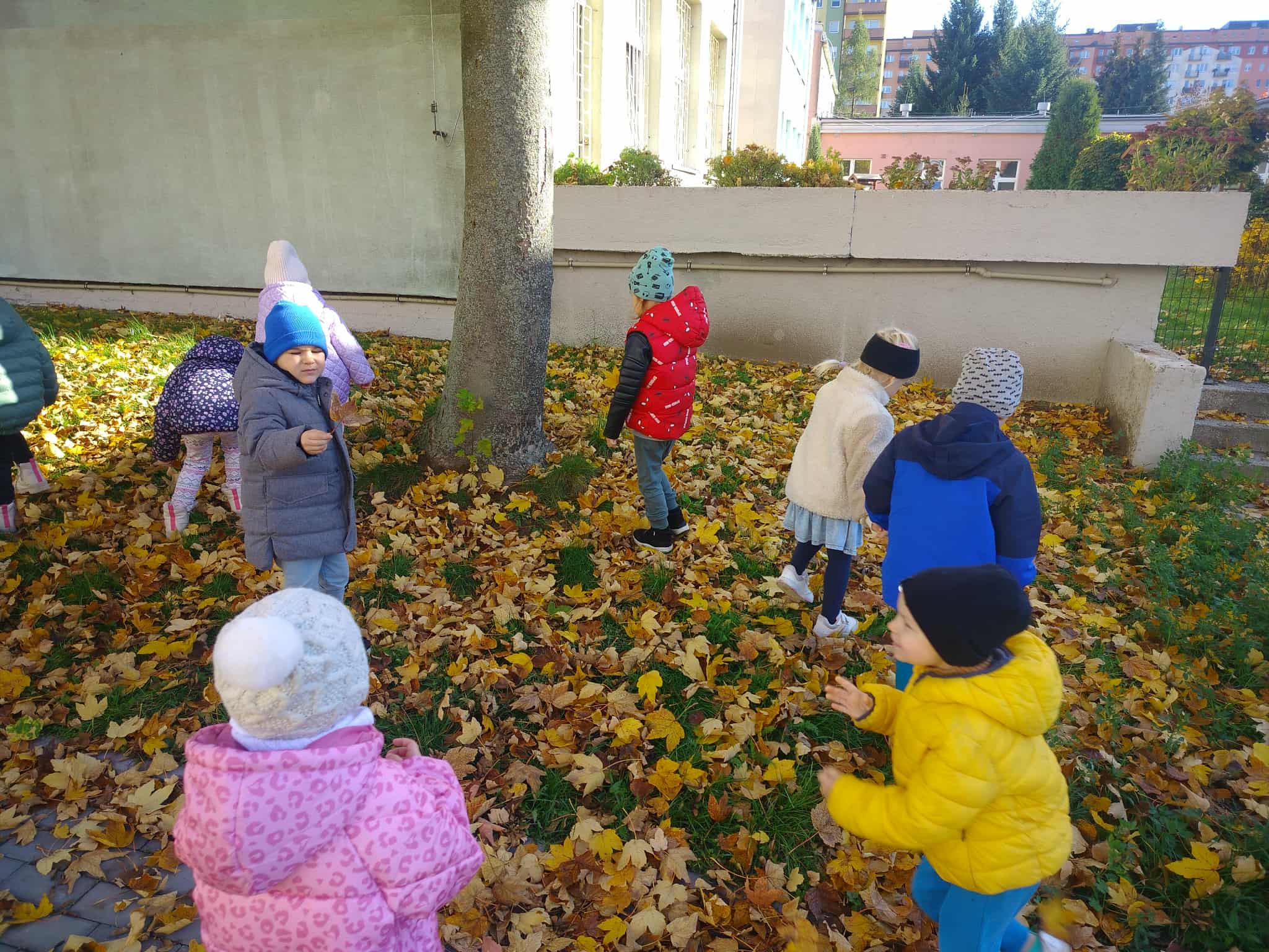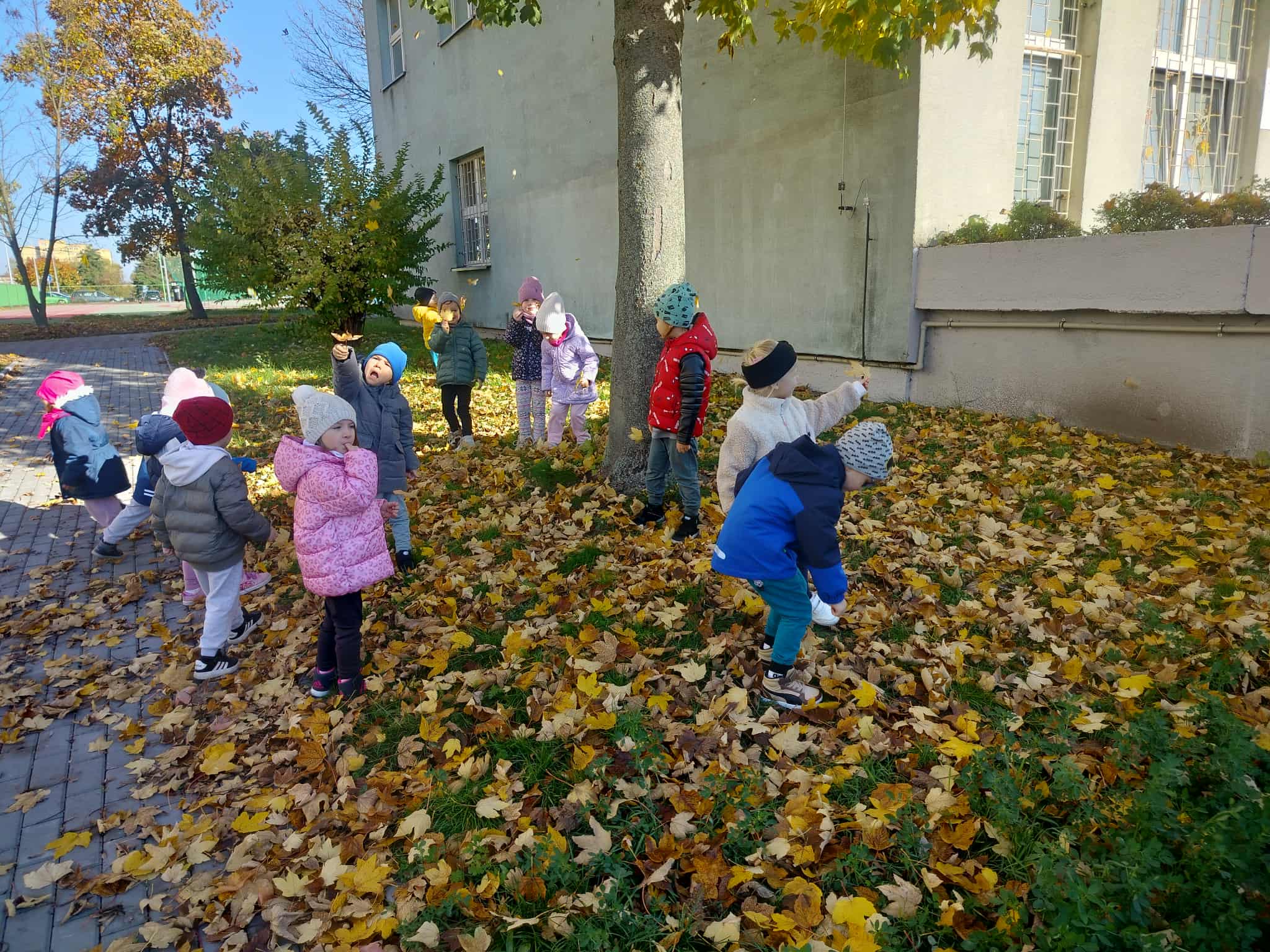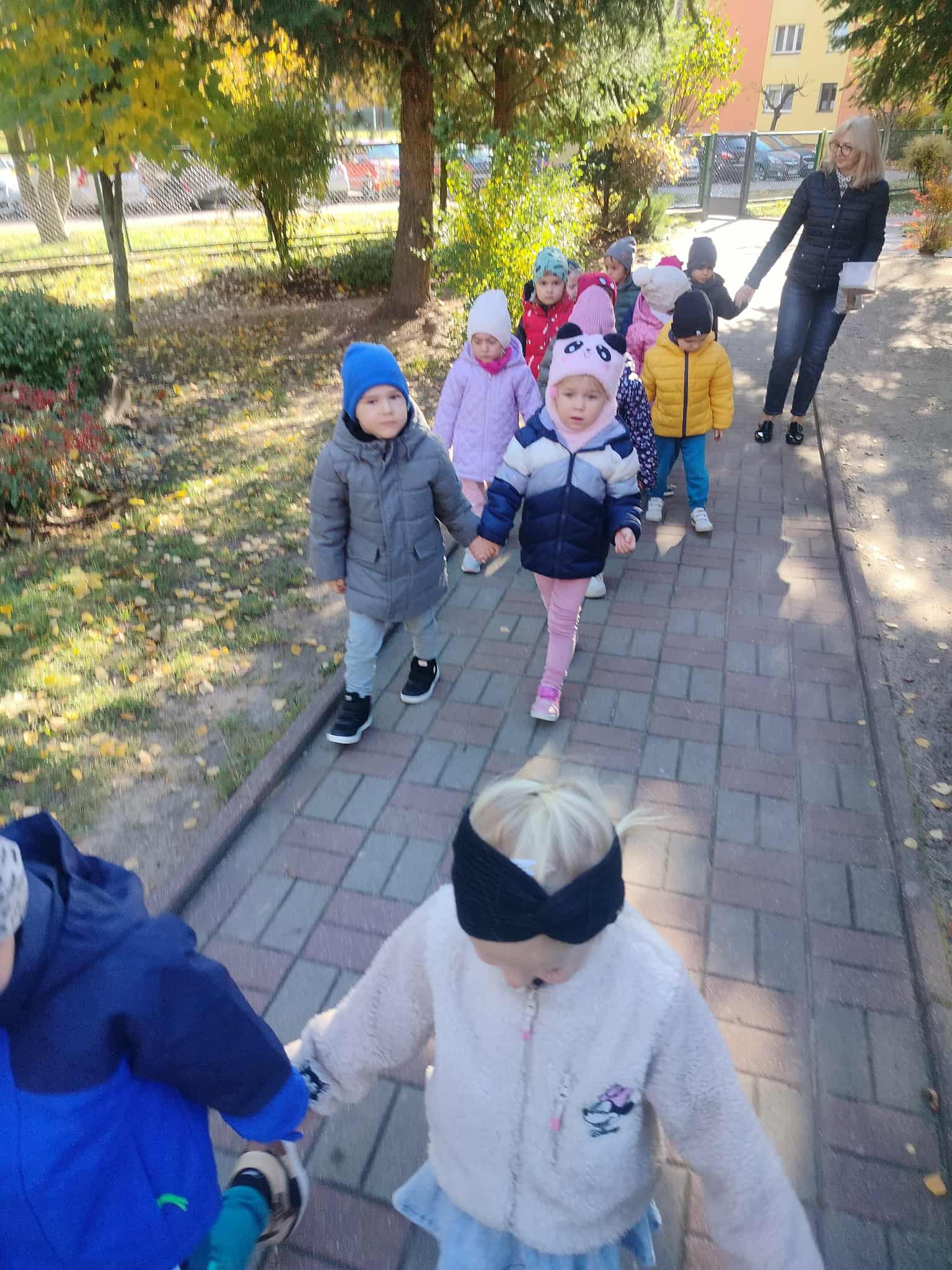 Korzystając z pięknej, jesiennej pogody, dzieci z grupy Słoneczka wybrały się na spacer. Był to szczególny spacer, ponieważ po raz pierwszy szły w parach bez pomocy „węża”. Po drodze szukały karmników, do których ochoczo wsypywały ziarenka dla ptaków. Był też czas na poszukiwanie najbardziej kolorowych liści.