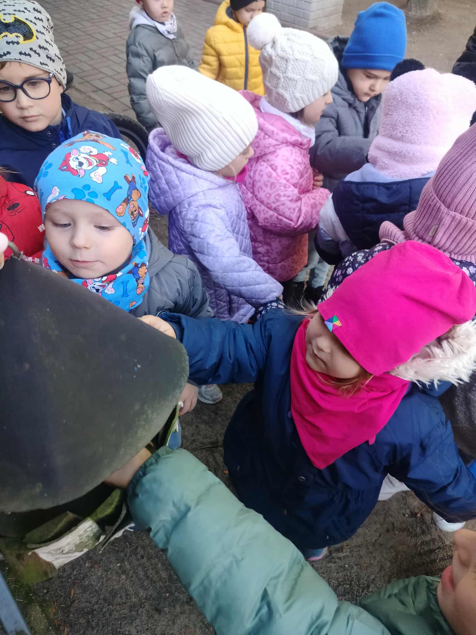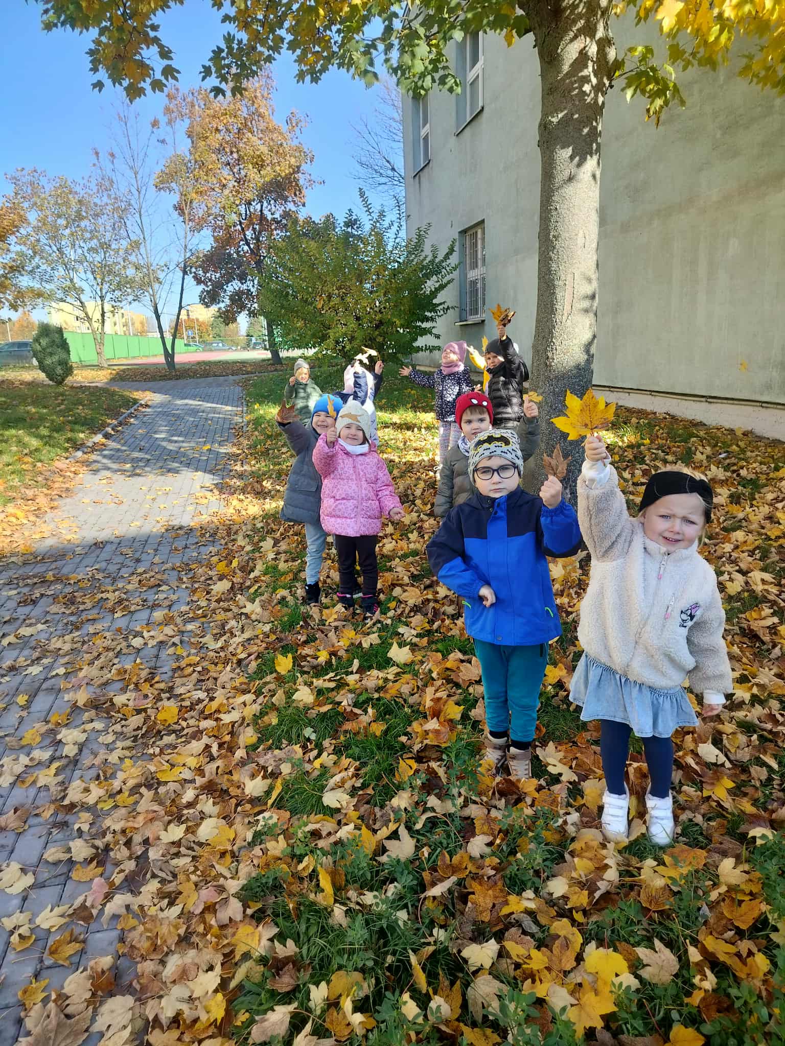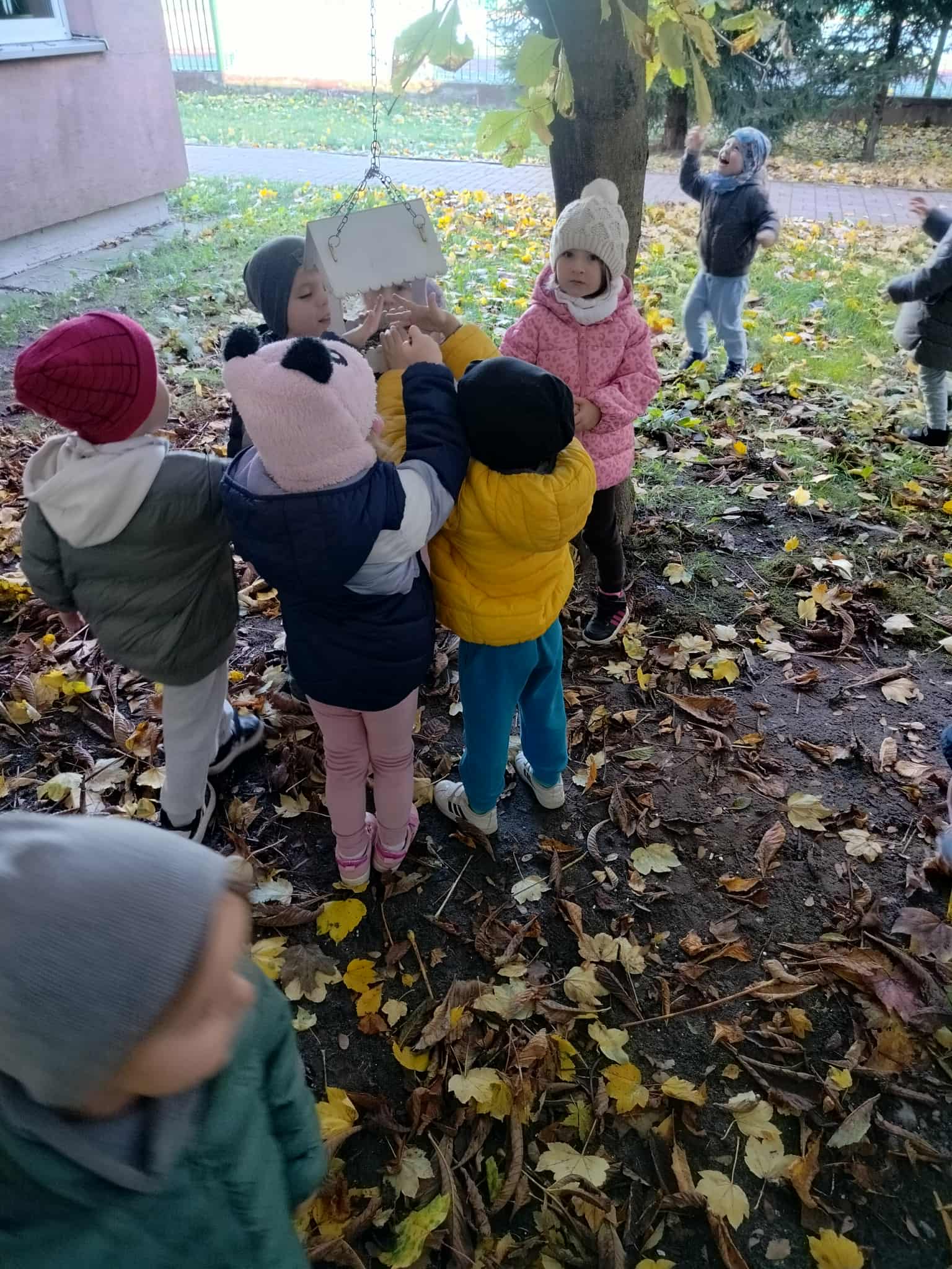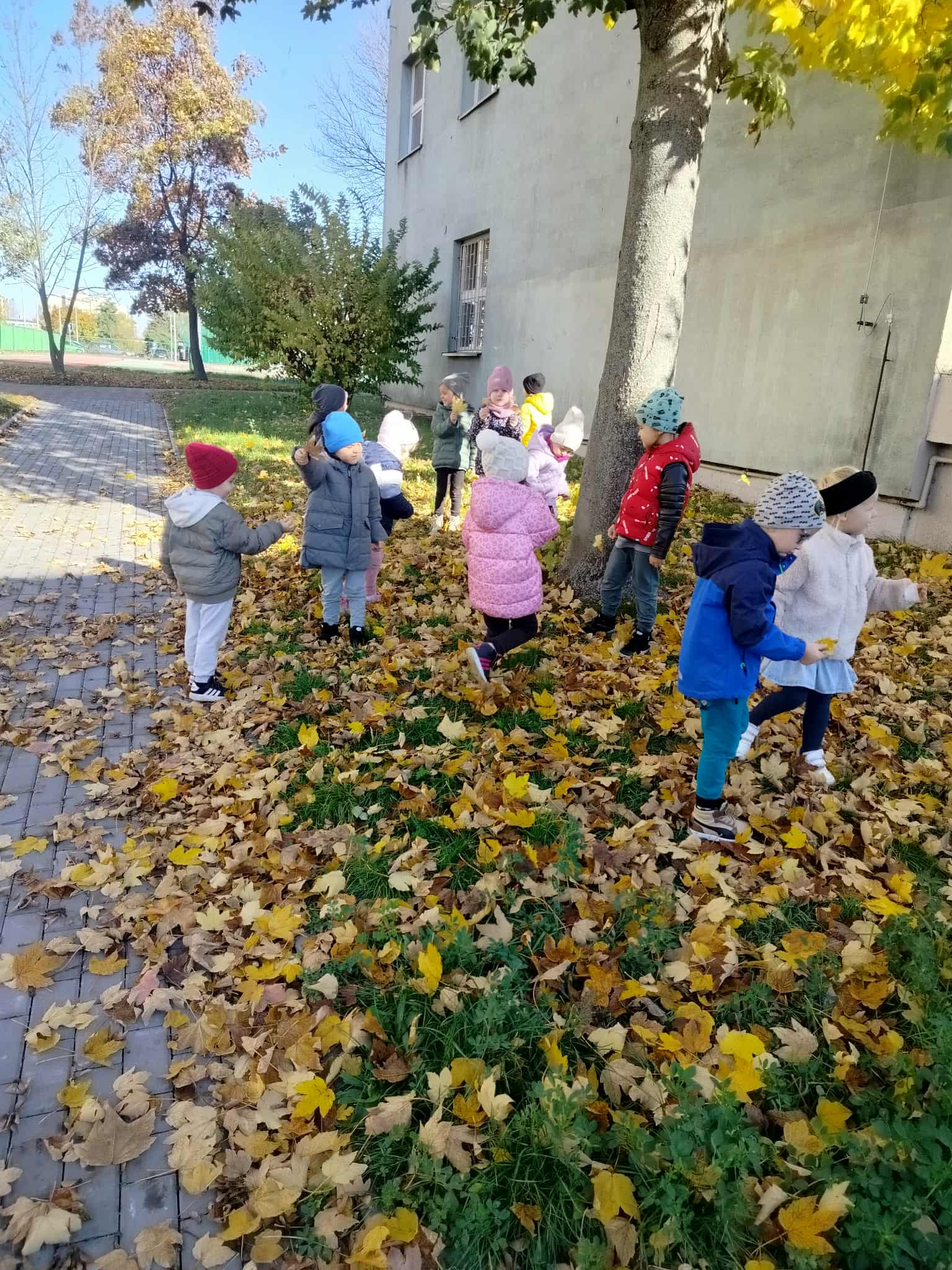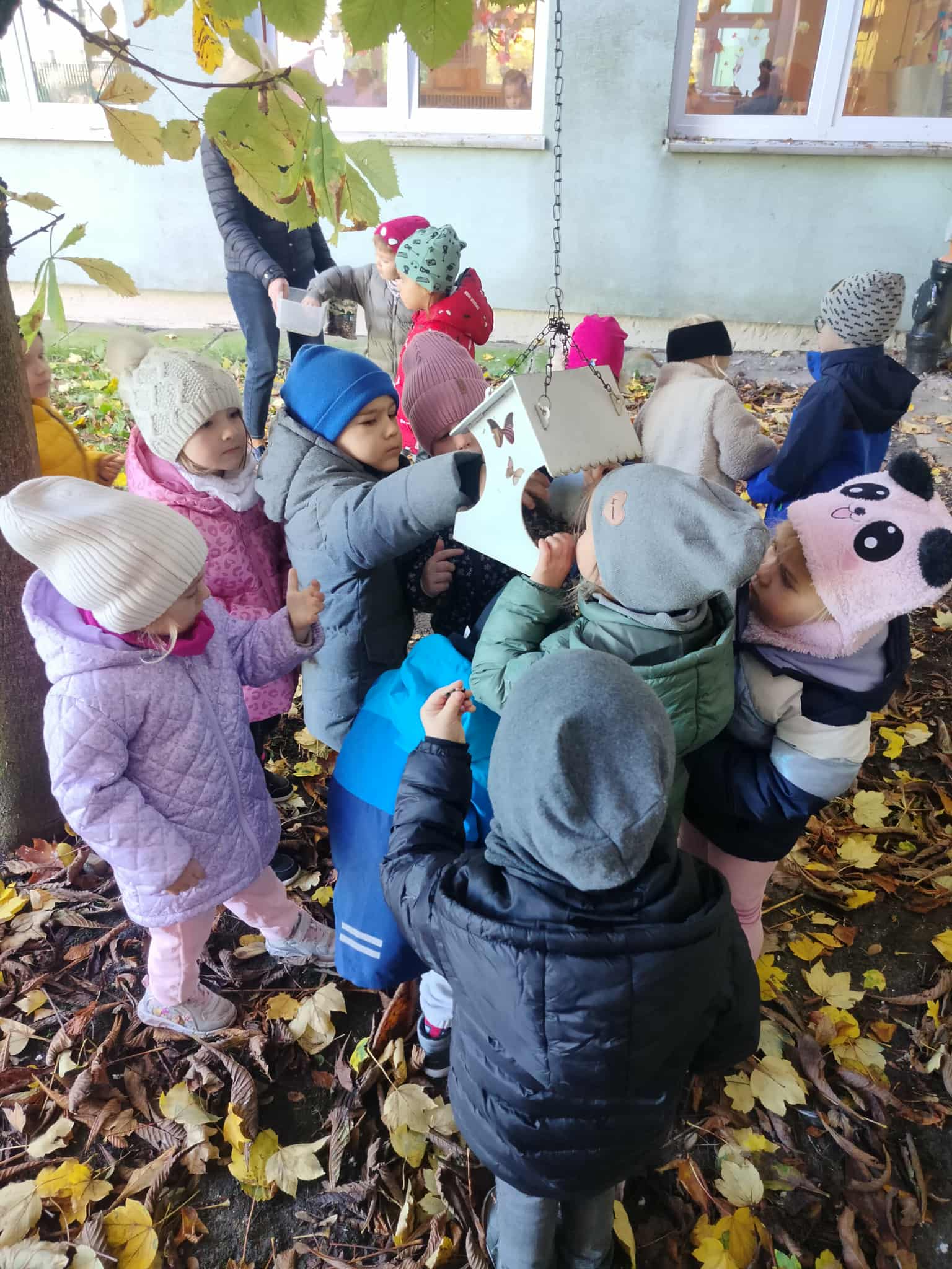 Korzystając z pięknej, jesiennej pogody, dzieci z grupy Słoneczka wybrały się na spacer. Był to szczególny spacer, ponieważ po raz pierwszy szły w parach bez pomocy „węża”. Po drodze szukały karmników, do których ochoczo wsypywały ziarenka dla ptaków. Był też czas na poszukiwanie najbardziej kolorowych liści.