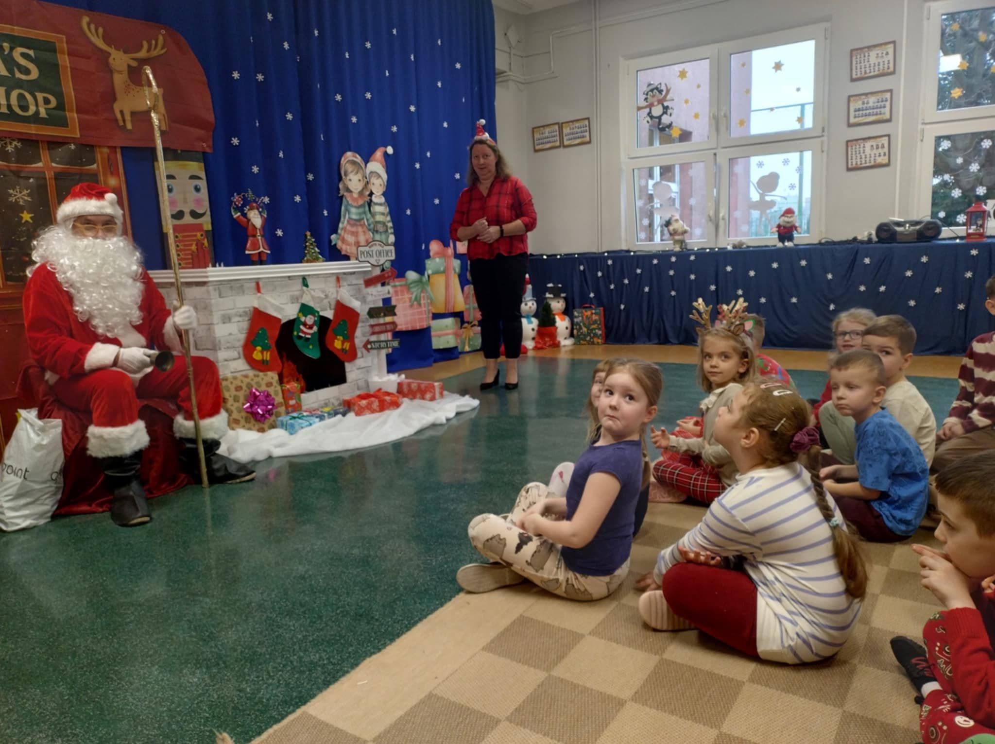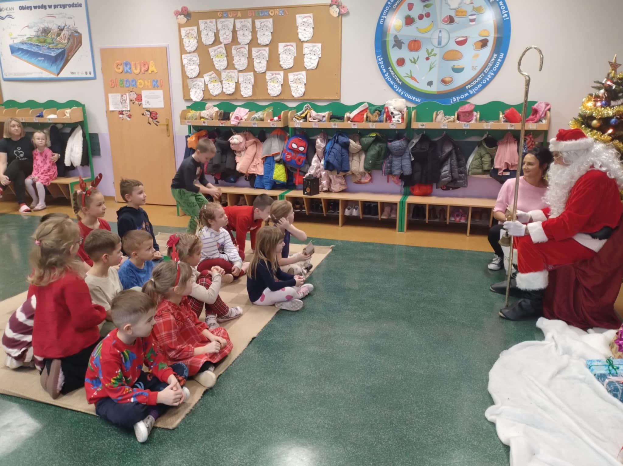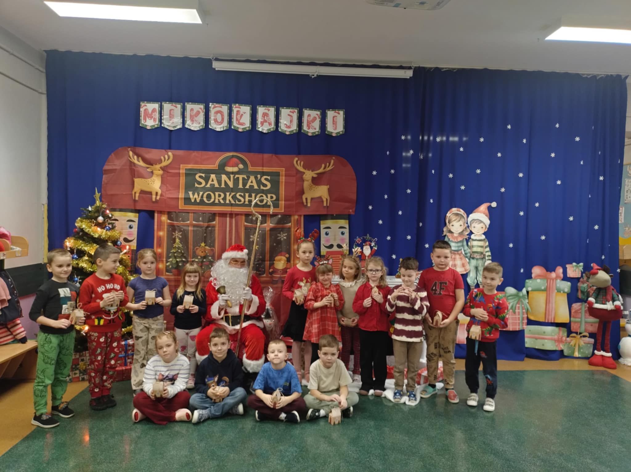 5 grudnia w przedszkolu był pełen magii i radosnego oczekiwania. Już od rana dzieci z niecierpliwością wypatrywały niezwykłego gościa. Święty Mikołaj w czerwonym płaszczu, z białą brodą i wielkim workiem prezentów siedział i czekał na dzieci na holu przedszkolnym . Na twarzach przedszkolaków pojawiły się szerokie uśmiechy, a niektórzy z wrażenia otwierali oczy ze zdumienia. Mikołaj przywitał dzieci ciepłymi słowami i chwilę z nimi porozmawiał. Przedszkolaki z dumą zaprezentowały mu piosenkę, którą nauczyły się na tę okazję. Mikołaj uważnie słuchał, chwalił ich za odwagę, każde dziecko otrzymało drobny upominek oraz życzenia świąteczne. Na zakończenie dzieci zrobiły sobie pamiątkowe zdjęcia z Mikołajem i obiecały, że przez cały rok będą grzeczne.