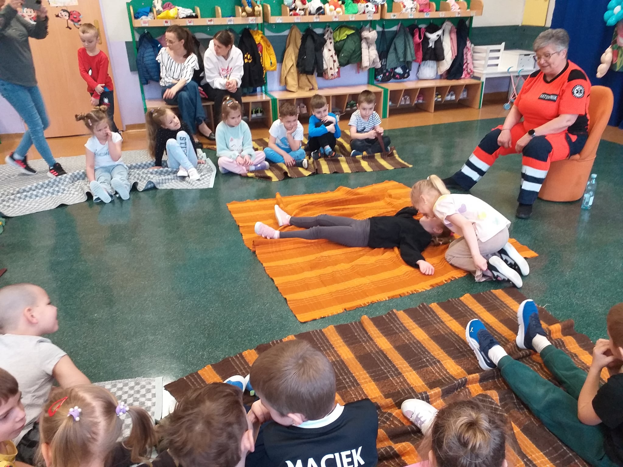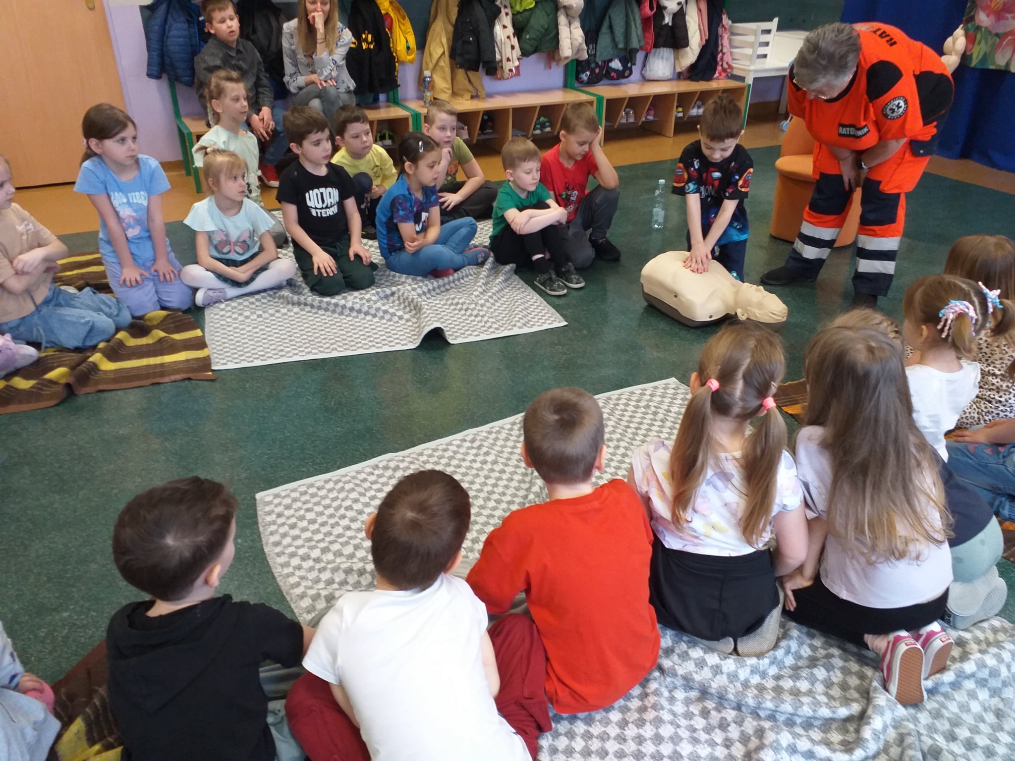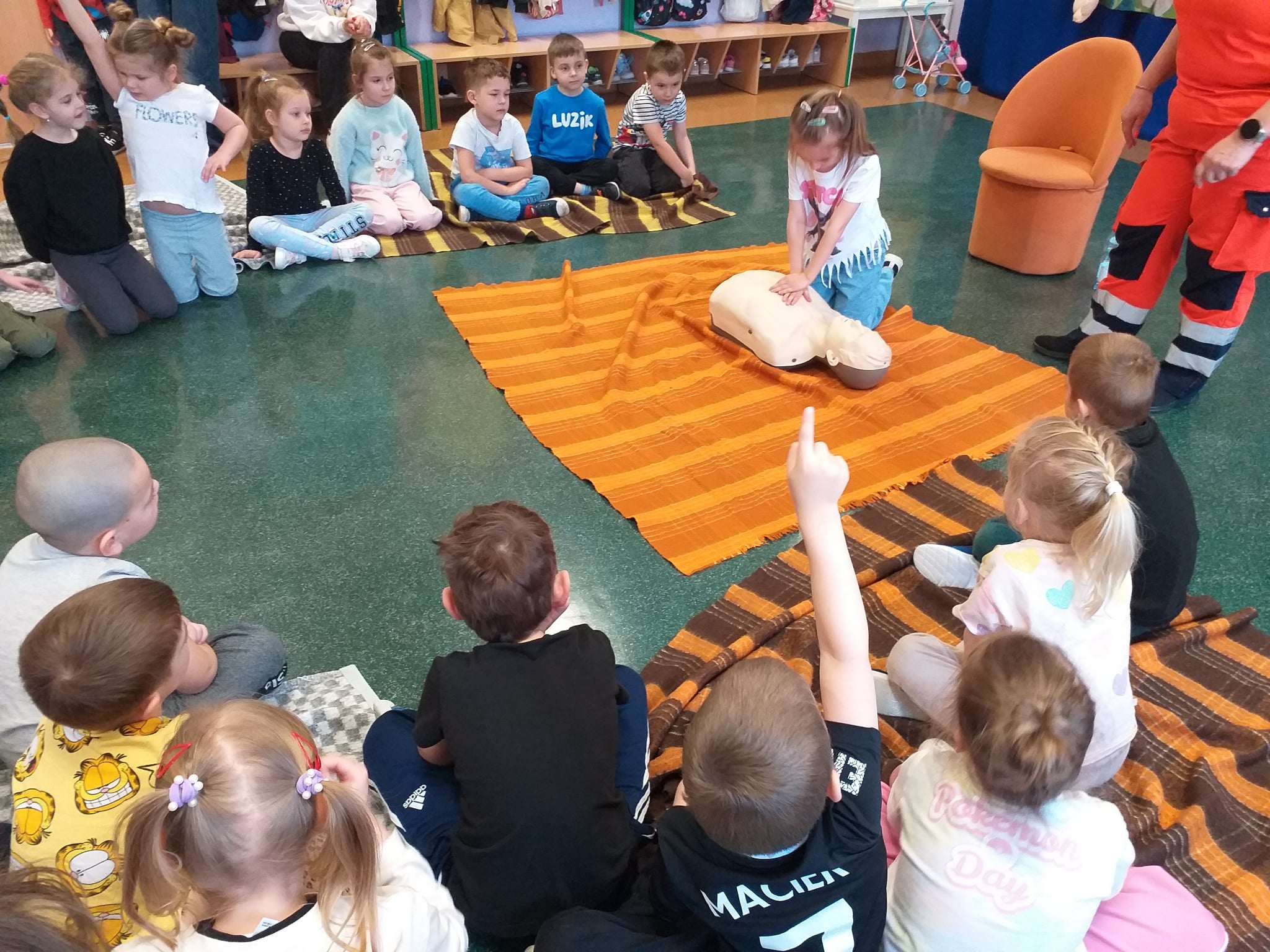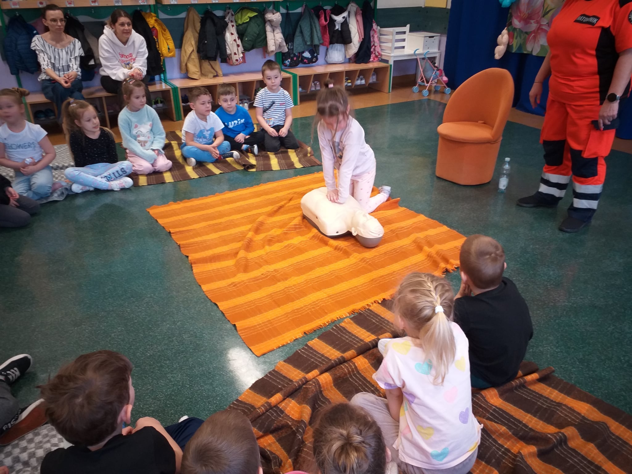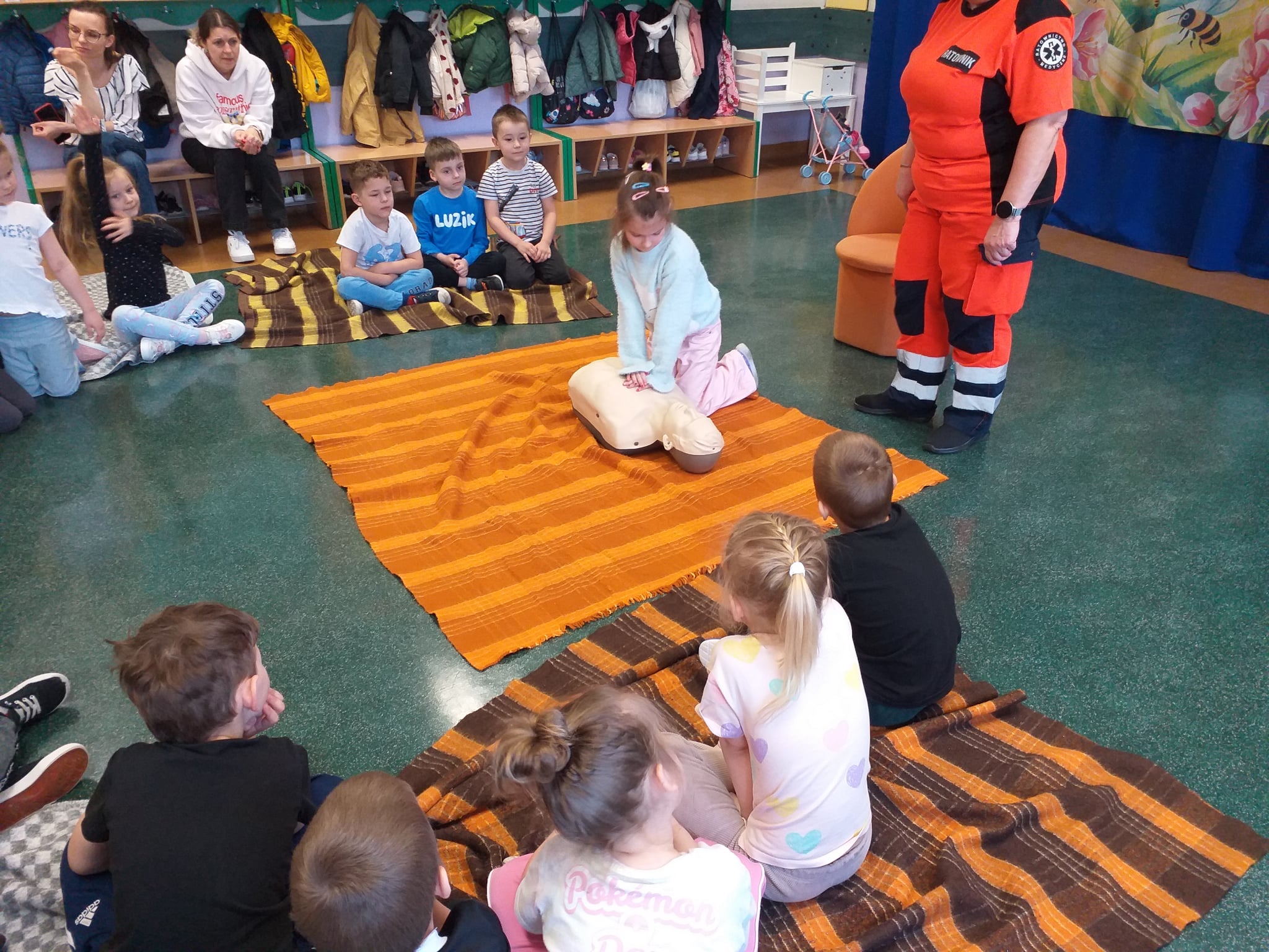 We wtorek 24 marca w naszym przedszkolu odbyło się spotkanie z ratownikiem medycznym. Uczestniczyły w nim wszystkie dzieci 5-letnie i 6-letnie. Pani ratownik zapoznała dzieci z zasadami udzielania pierwszej pomocy. Przedszkolaki przypomniały sobie numery alarmowe. Dowiedziały się jak należy sprawdzać przytomność osoby poszkodowanej. Uczyły się układania człowieka w pozycji bocznej ustalonej oraz ćwiczyły umiejętność wykonywania czynności ratujących życie na fantomie.