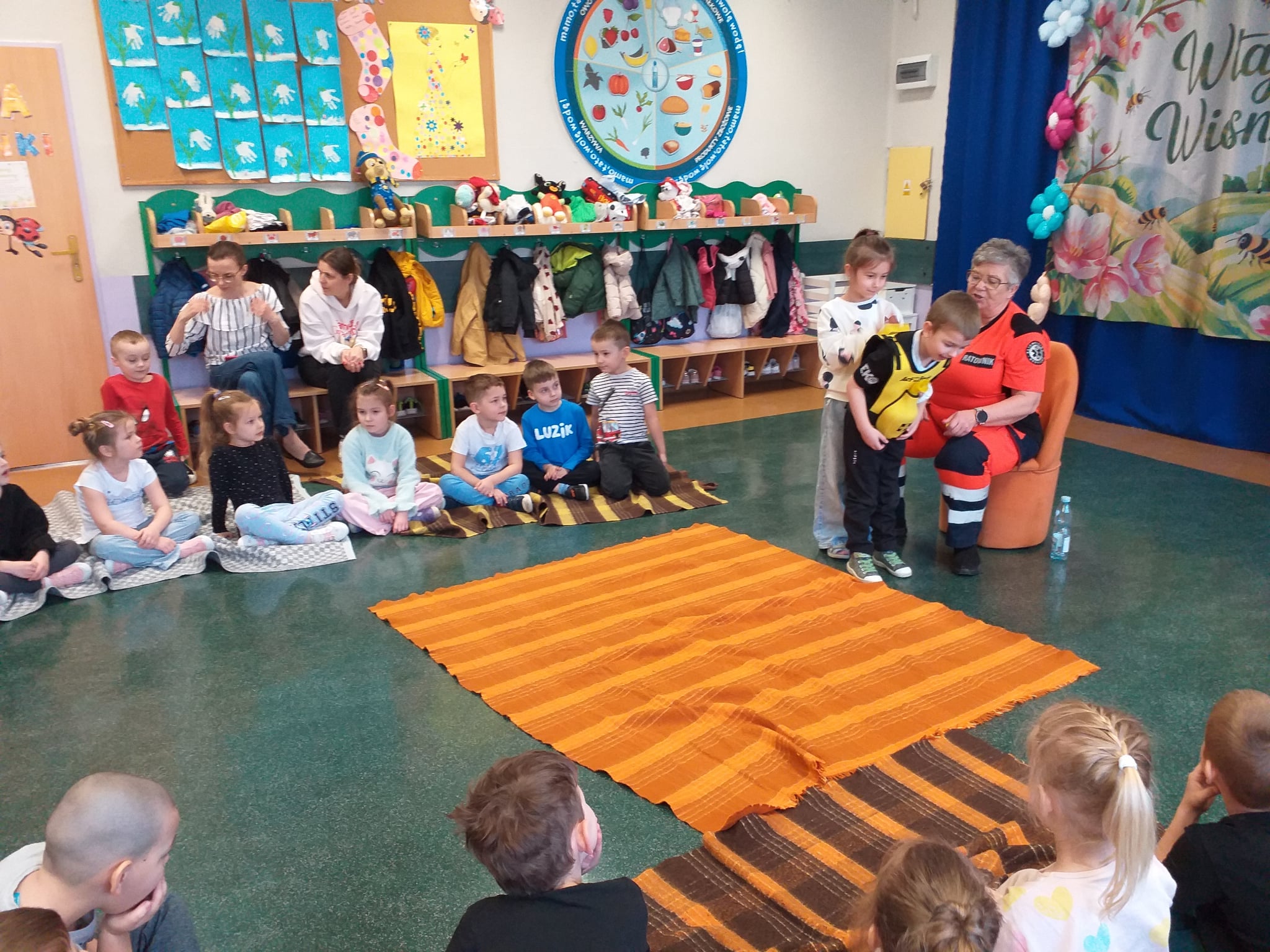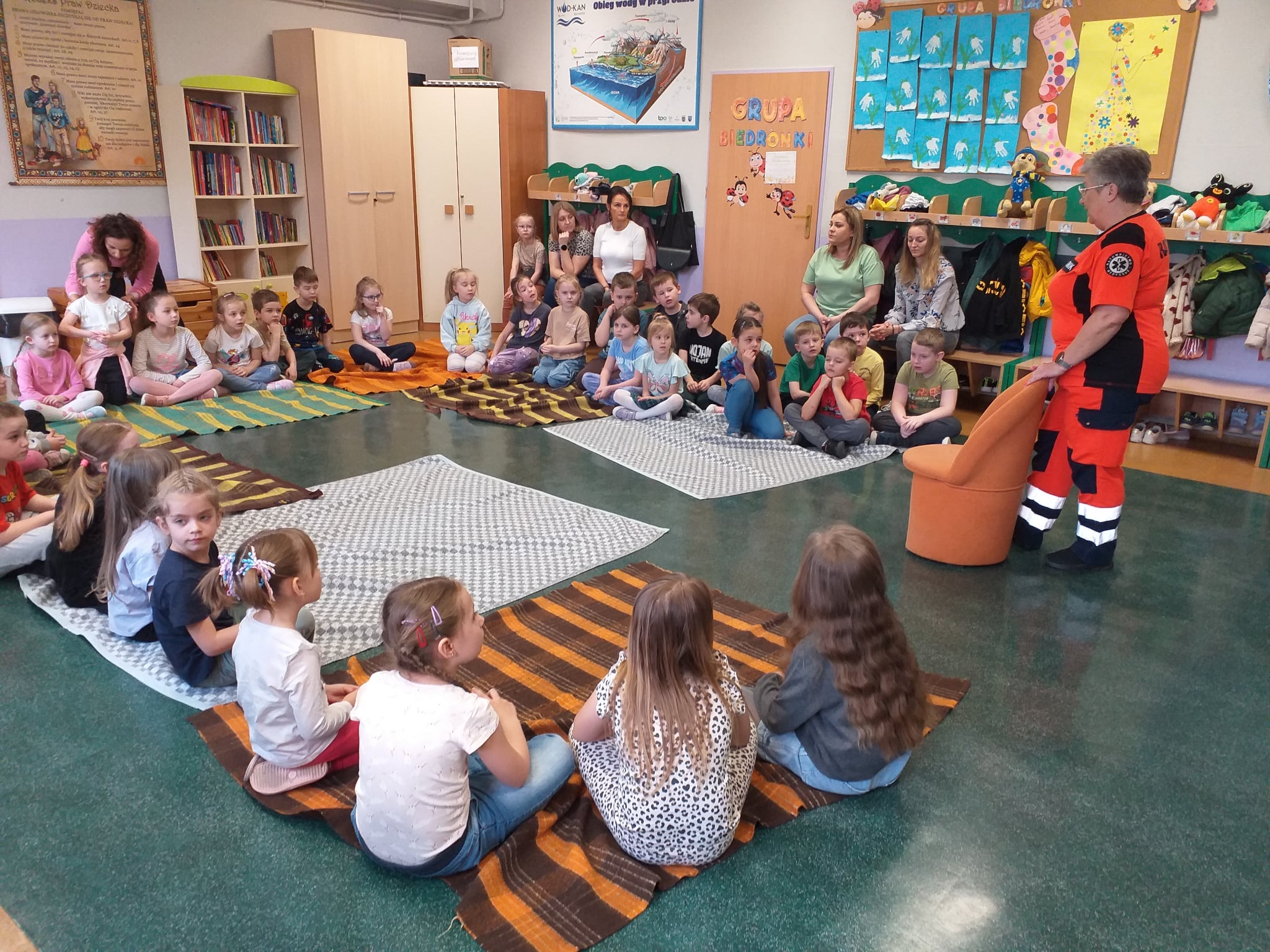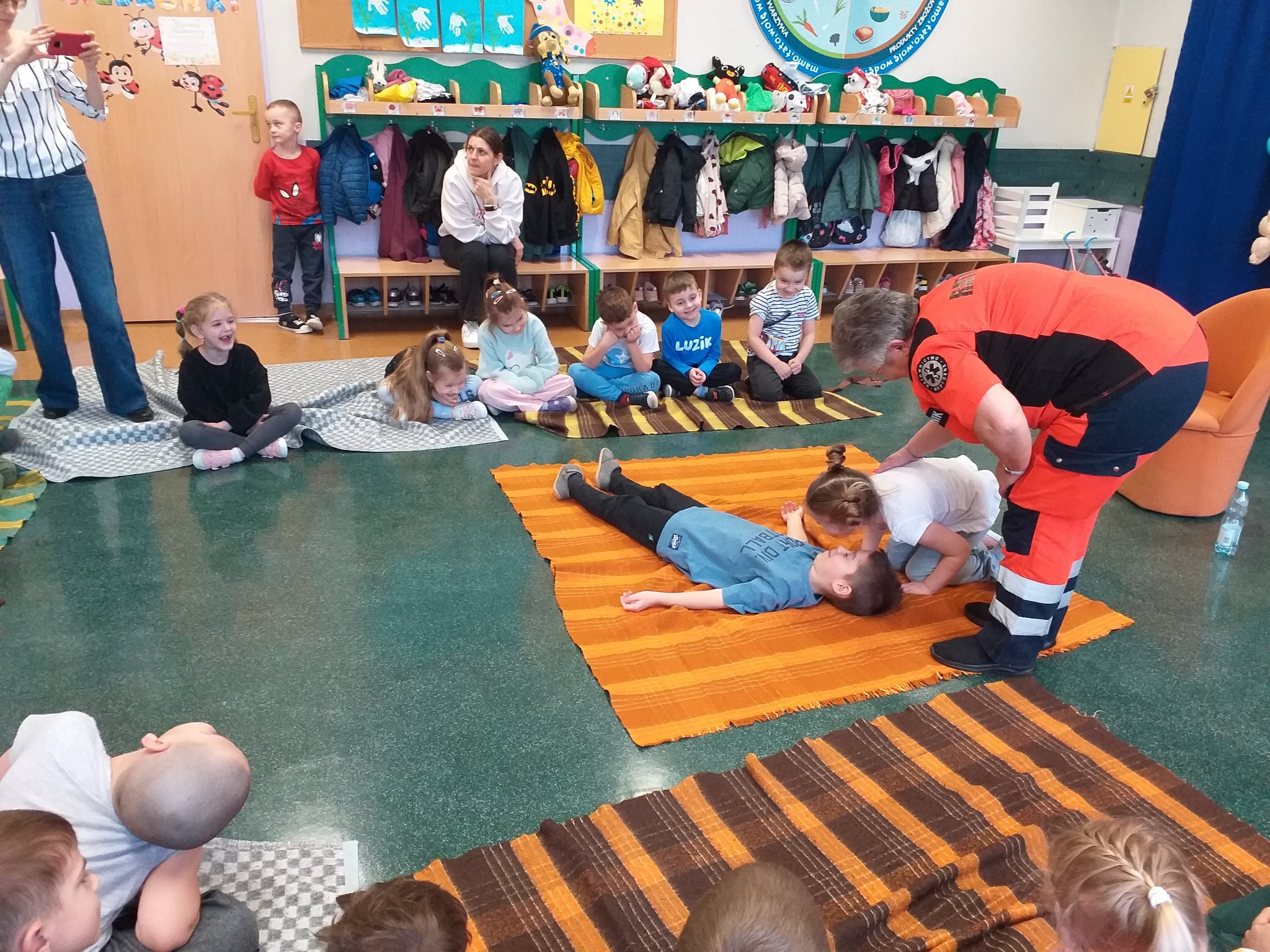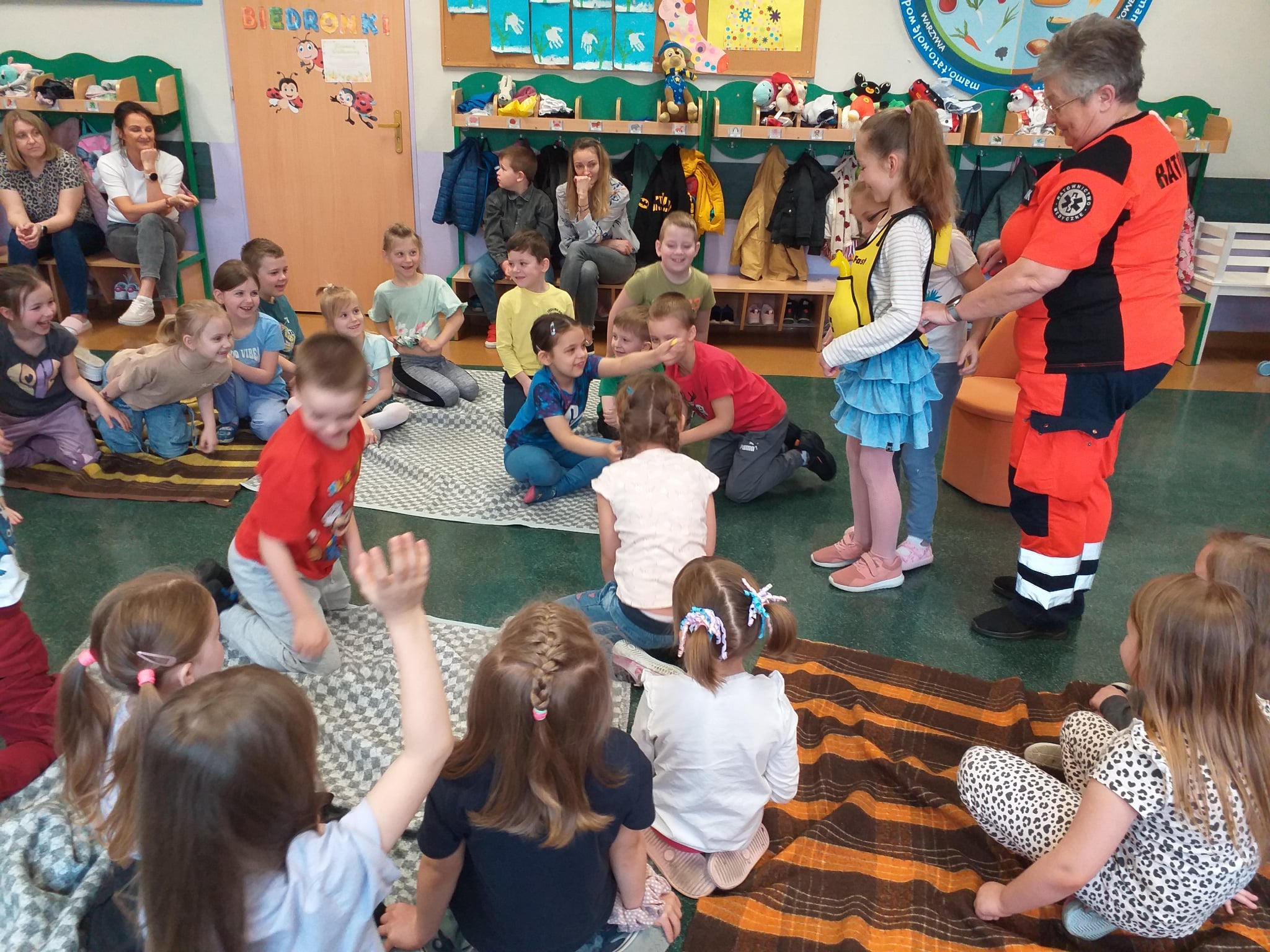 We wtorek 24 marca w naszym przedszkolu odbyło się spotkanie z ratownikiem medycznym. Uczestniczyły w nim wszystkie dzieci 5-letnie i 6-letnie. Pani ratownik zapoznała dzieci z zasadami udzielania pierwszej pomocy. Przedszkolaki przypomniały sobie numery alarmowe. Dowiedziały się jak należy sprawdzać przytomność osoby poszkodowanej. Uczyły się układania człowieka w pozycji bocznej ustalonej oraz ćwiczyły umiejętność wykonywania czynności ratujących życie na fantomie.