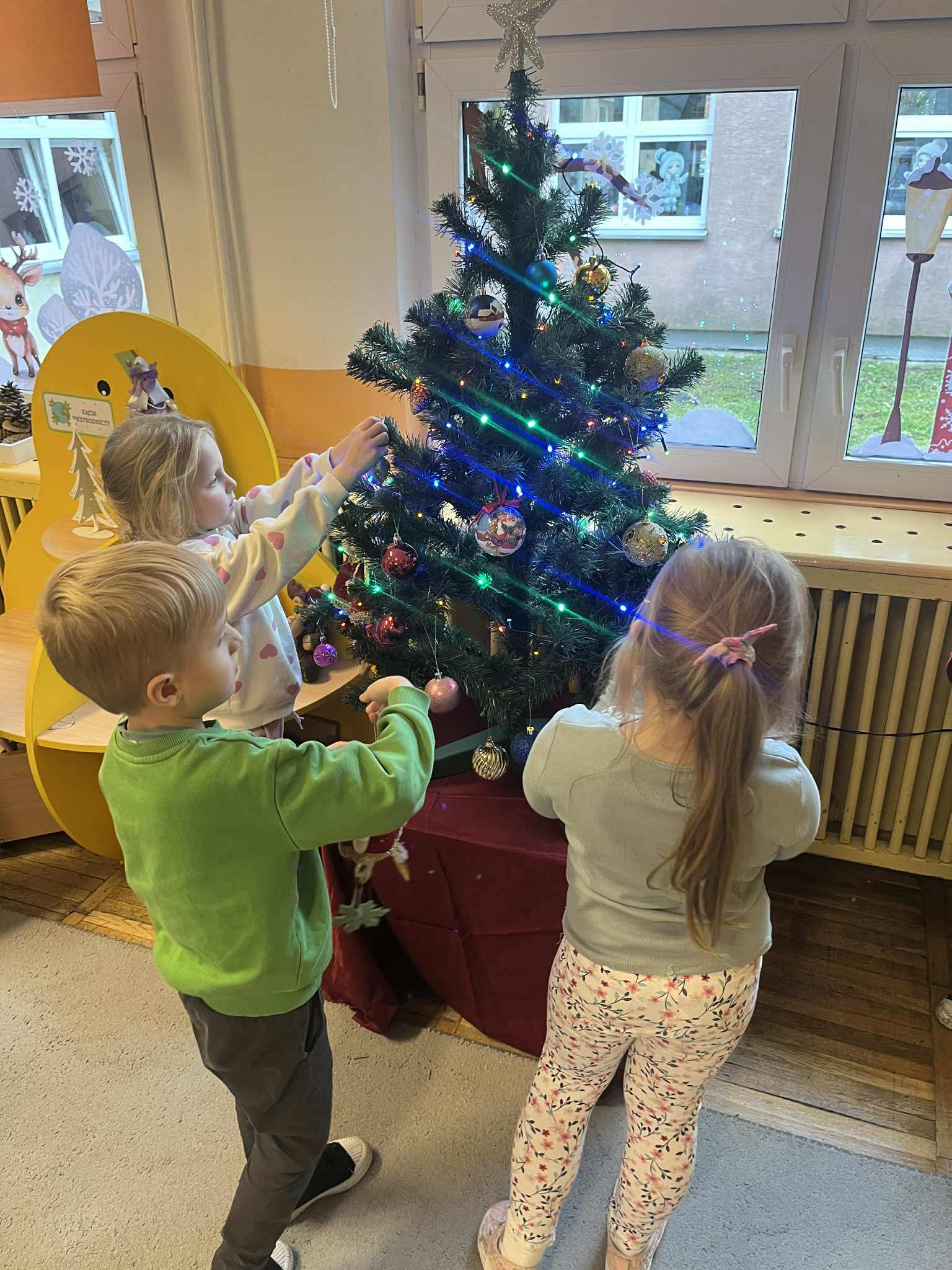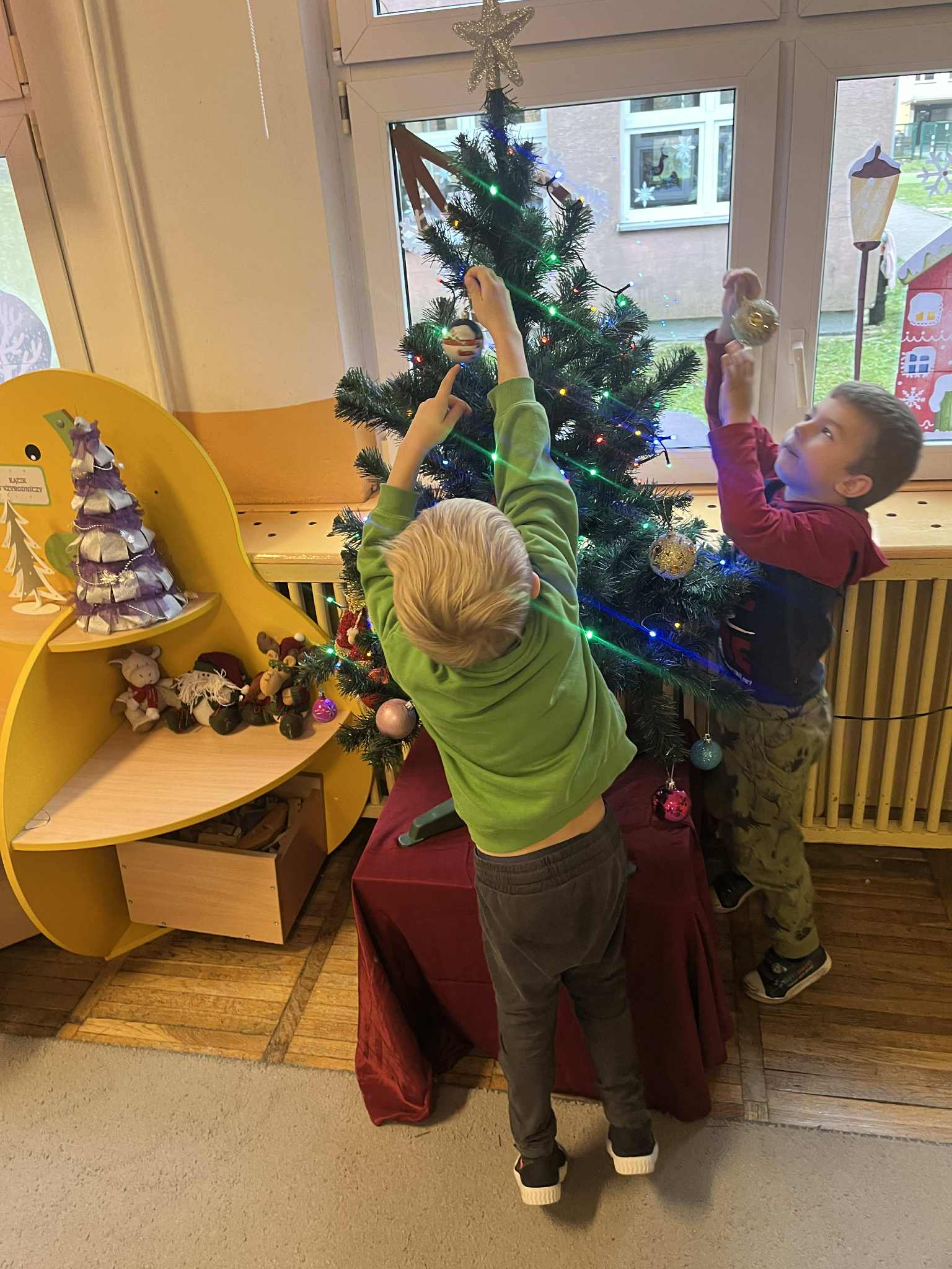 Święta Bożego Narodzenia wiążą się z tradycją ubierania świątecznego drzewka. W grupie Żabki również nie mogło zabraknąć tego rytuału. Dzień ubierania choinki w przedszkolu jest dniem wyjątkowym. Dzieci z wielkim zaangażowaniem zawieszały choinkowe ozdoby. Ileż było radości wśród dzieci a w sali od razu zrobiło się świątecznie. Drzewko zostało przystrojone bardzo szybko, wygląda wyjątkowo i przypomina nam, że Święta Bożego Narodzenia już tuż, tuż…Wszystkie dzieci jednogłośnie stwierdziły, że choinka jest prześliczna, a na koniec nie mogło obejść się bez grupowego zdjęcia z świątecznym drzewkiem.