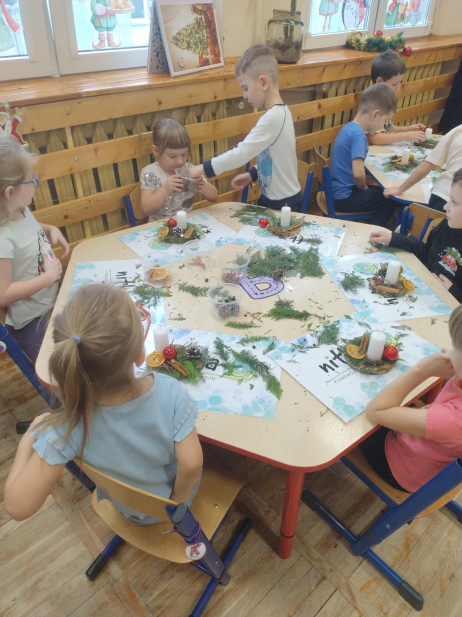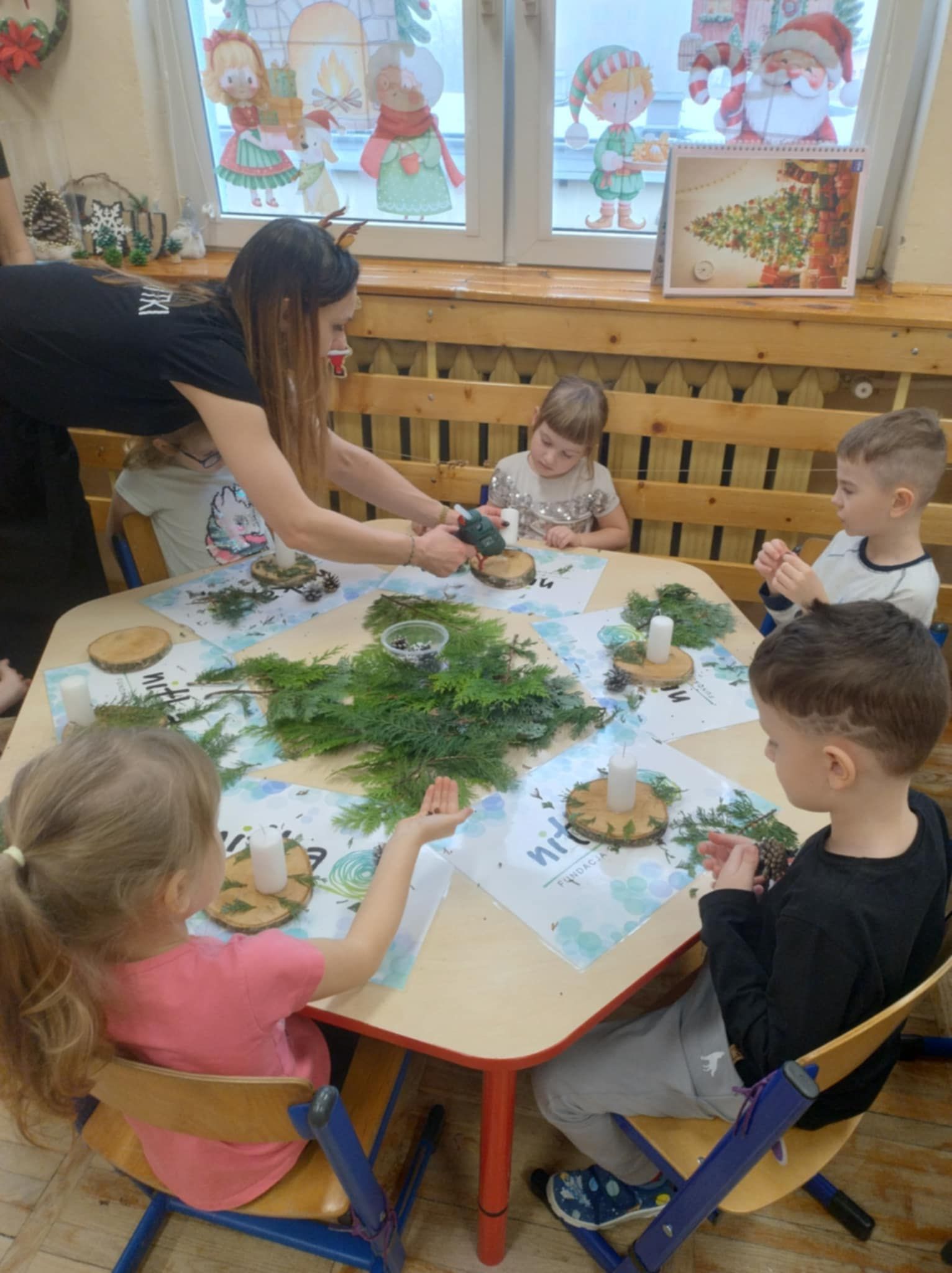 4 grudnia w naszej grupie odbyły się wyjątkowe warsztaty mikołajkowe z robienia stroików na świąteczny stół podczas których dzieci, tworzyły własne świąteczne stroiki. Na początku zajęć przedszkolaki poznały różne materiały dekoracyjne — gałązki świerku, szyszki, wstążki, suszone owoce, małe ozdoby oraz bezpieczne elementy mocujące. Panie prowadzące opowiedziały skąd biorą się tradycje związane ze stroikami i dlaczego są one symbolem świątecznego nastroju. Następnie dzieci rozpoczęły samodzielną pracę. Z dużym zaangażowaniem komponowały własne dekoracje, ćwicząc przy tym kreatywność, zdolności manualne oraz cierpliwość.