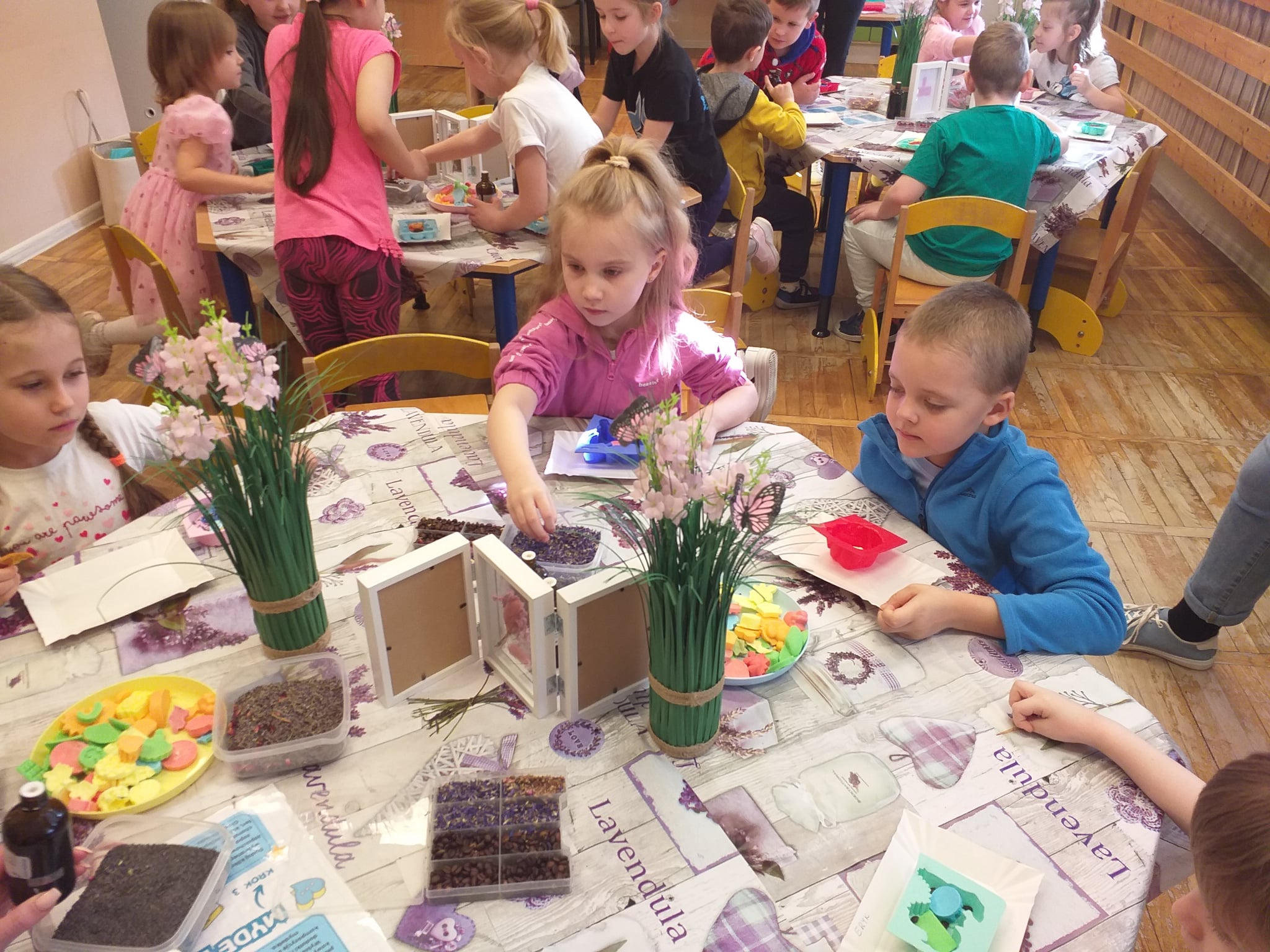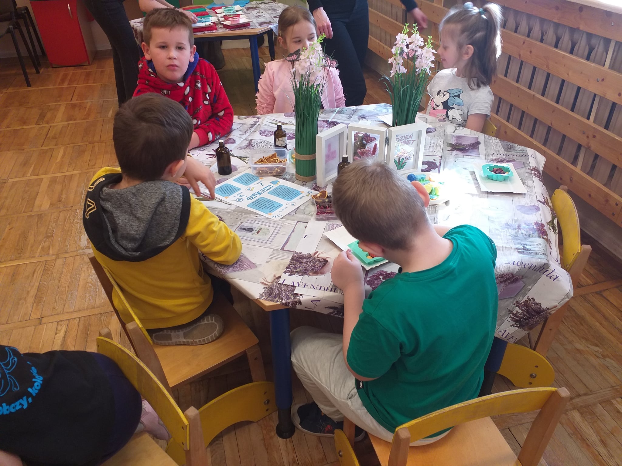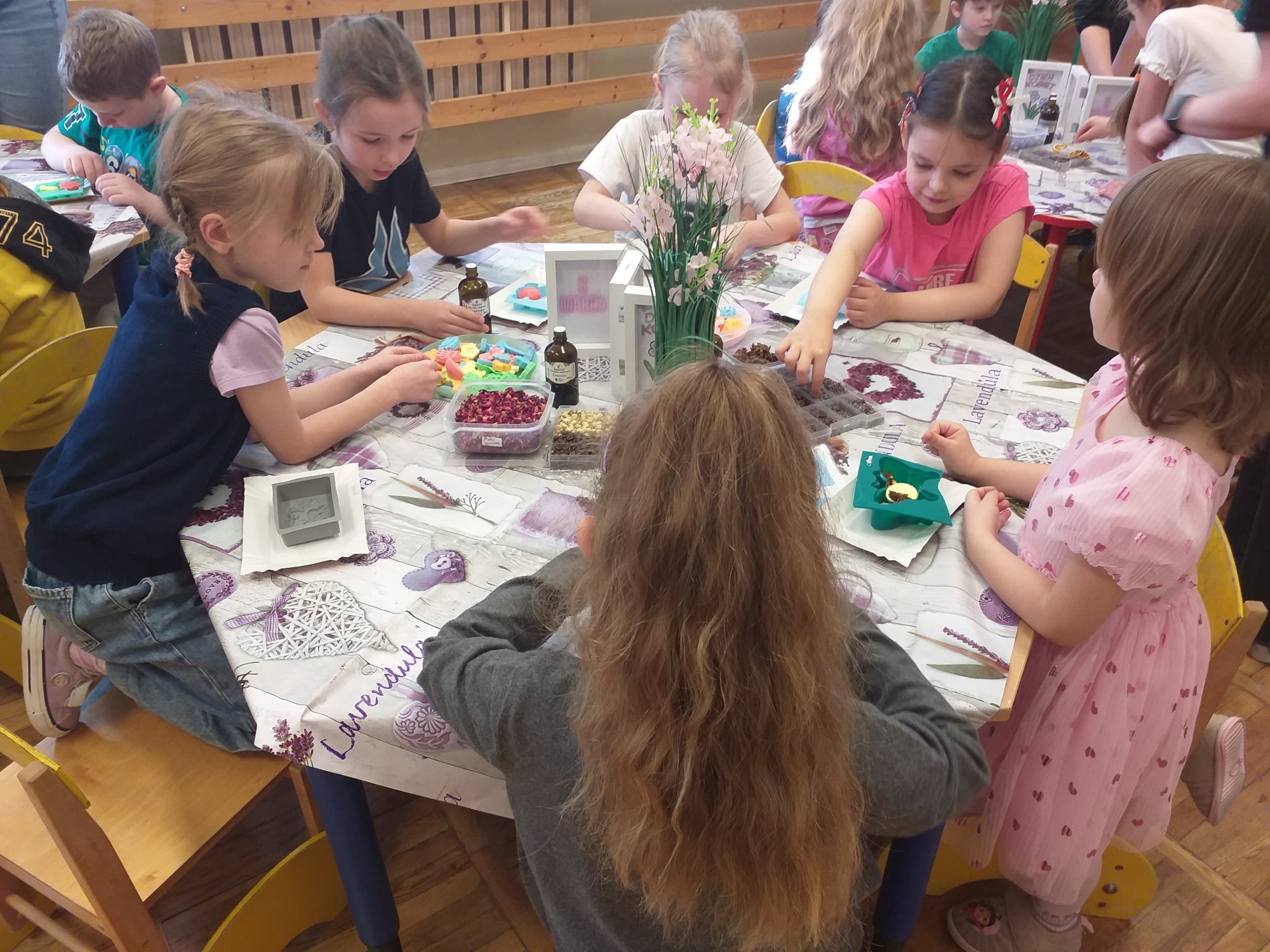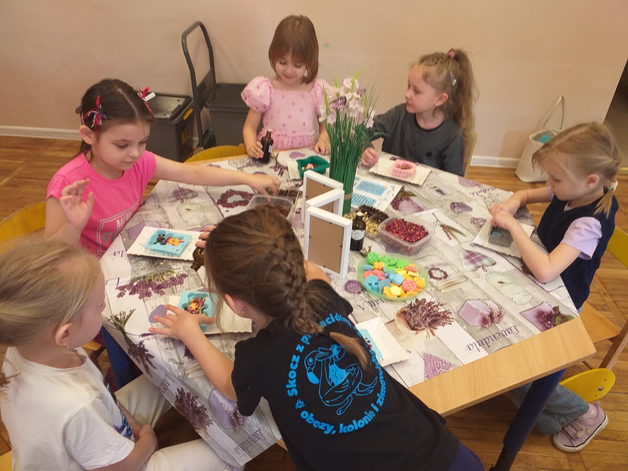 W środę dzieci z grupy Odkrywcy uczestniczyły w warsztatach mydlarskich z okazji Dnia Kobiet. Celem warsztatów było wykonanie mydełka własnego pomysłu. Na początku skomponowały własne mydełko z przeznaczonych do tego materiałów. Następnie słuchały prelekcji na temat mydła, jego właściwościach i zastosowaniu. Słuchały wiadomości o bakteriach i o tym, że trzeba przestrzegać zasad higieny. Uczyły się wierszyka o tym jak poprawnie myć ręce. Na zakończenie zapakowały gotowe, wykonane przez siebie mydełko do pięknie przyozdobionych torebeczek.