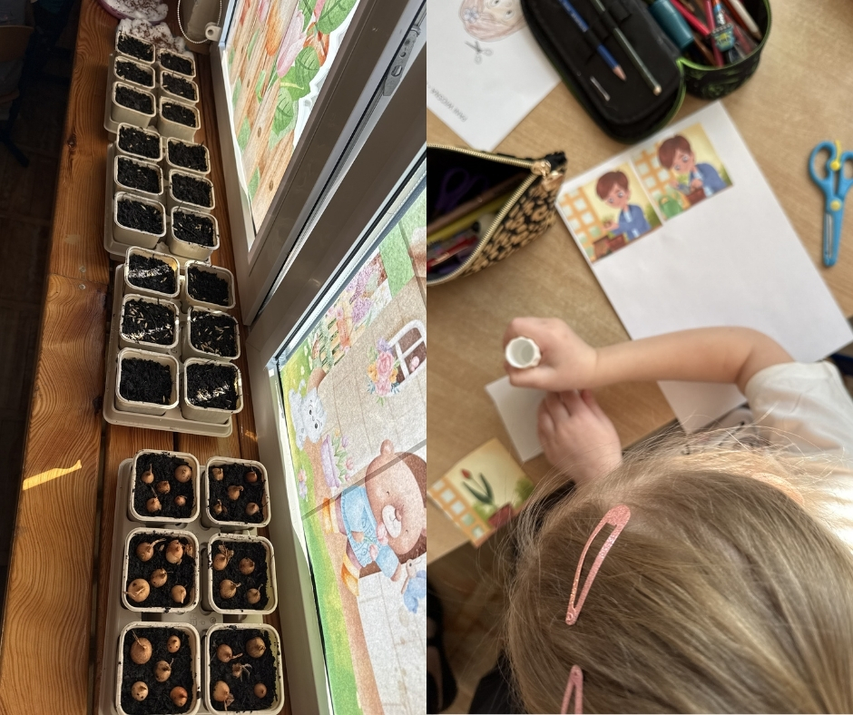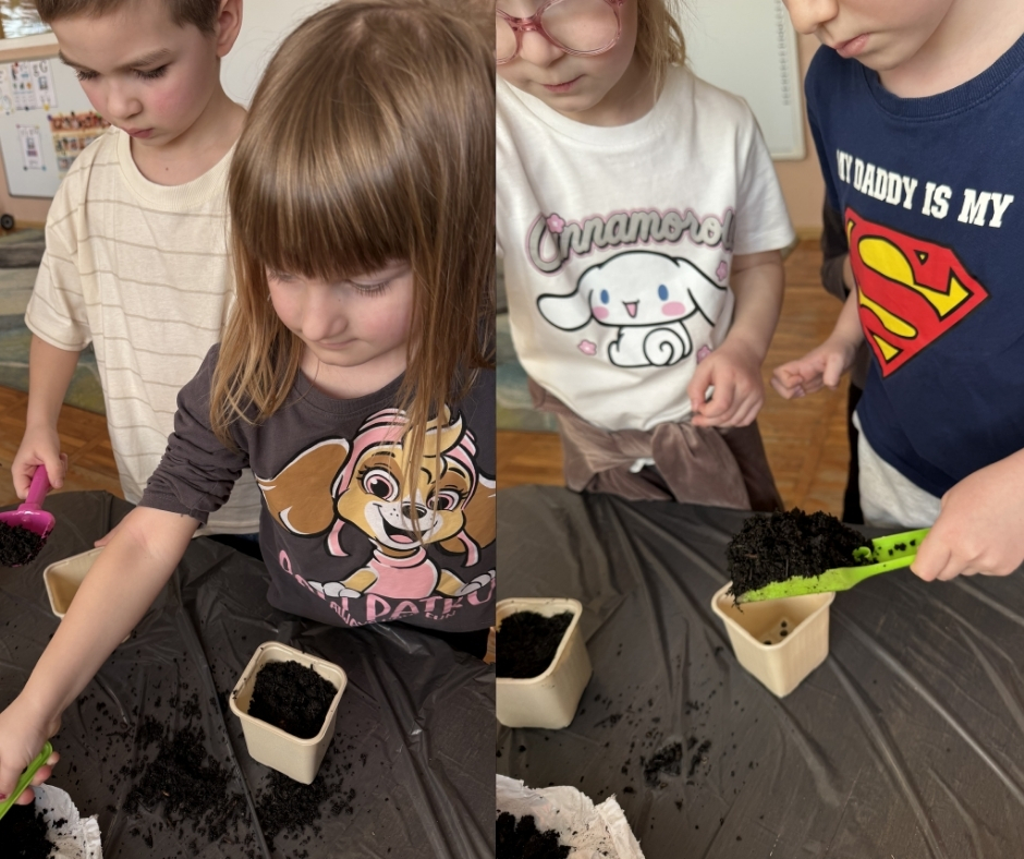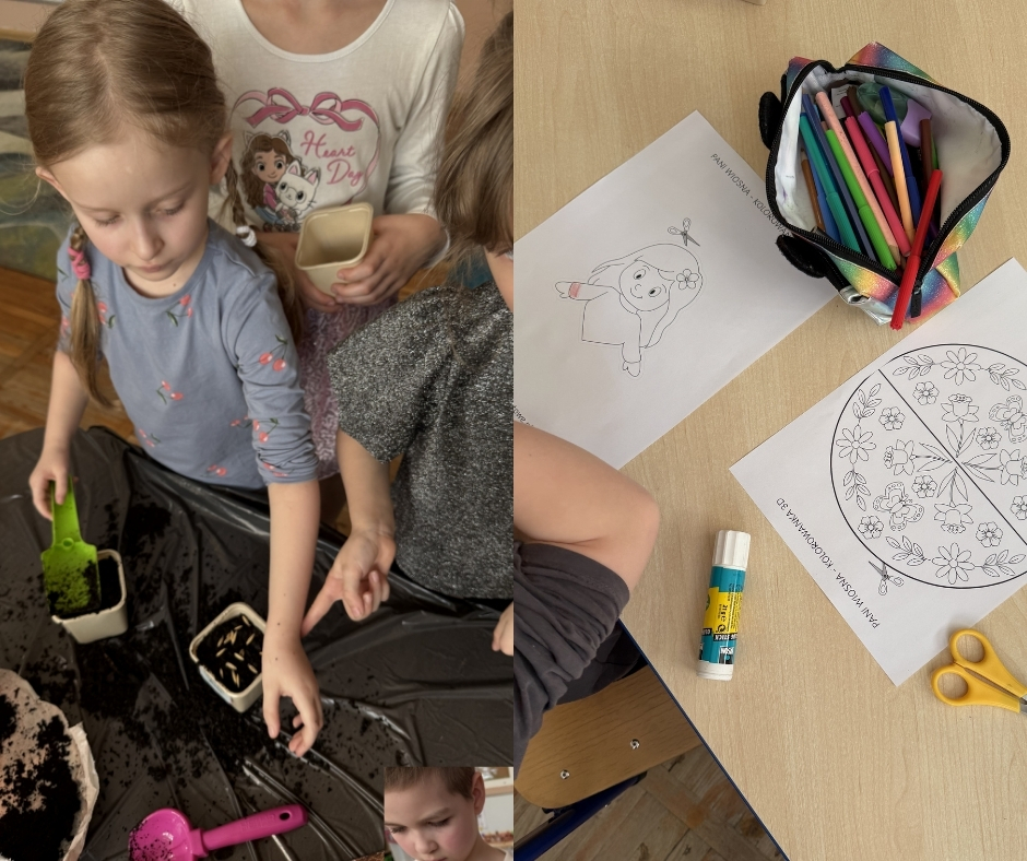 Smerfy oficjalnie przywitały Panią Wiosnę. Dzieci odczytały pozostawiony list i obiecały, że będą poszukiwać oznak wiosny w swoim najbliższym otoczeniu. Przedszkolaki założyły swój ogródek w sali. Znalazła się w nim oczywiście rzeżucha, dymka oraz owies, który każde dziecko zabierze ze sobą na Wielkanoc do domu. Dzieci nie mogły doczekać się ogrodniczych prac. Wykonały także swoje własne “Wiosenki”, które ozdobiły salę oraz układały logicznie historyjkę obrazkową na podstawie sadzenia tulipanów.